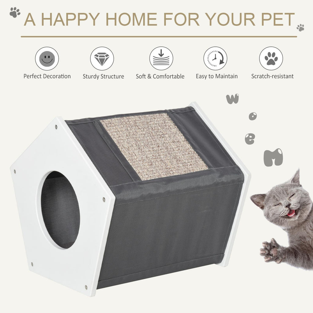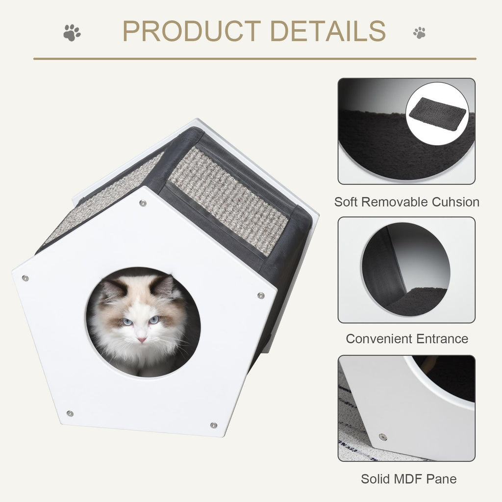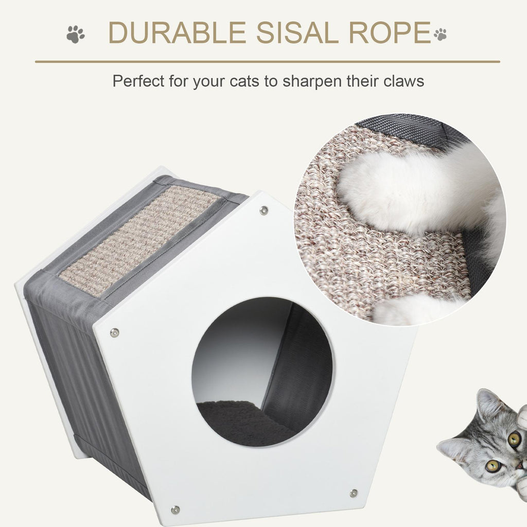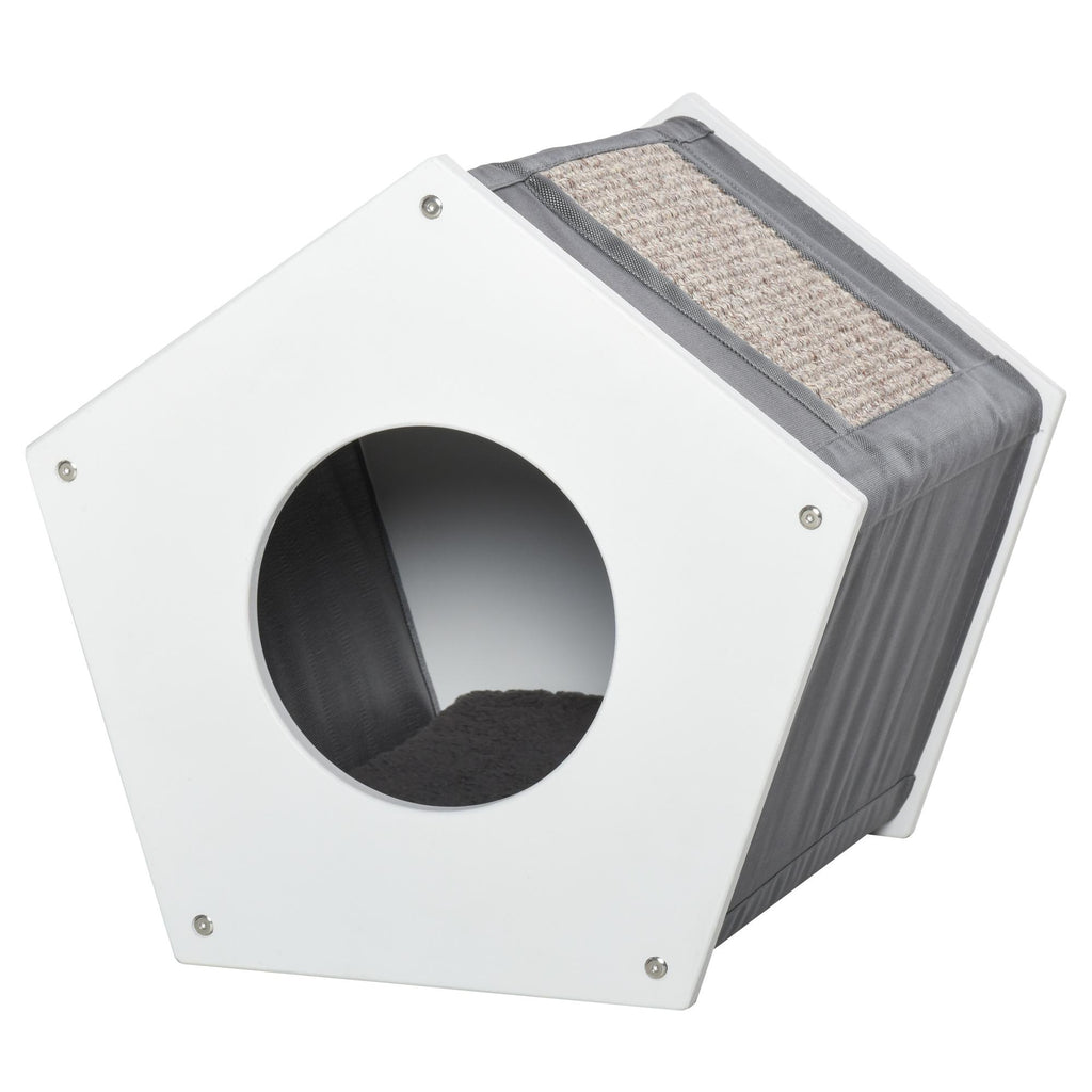 Gönnen Sie sich mit diesem Katzenhaus dem natürlichen Instinkt Ihrer Katze, sich zu verstecken und zu kratzen. Dank der Innenpolsterung und der geschlossenen Struktur finden Katzen eine angenehme Umgebung, in der sie sich sicher fühlen, um ein Nickerchen zu machen. Ihre Katzen müssen nicht weit gehen, um ihre Krallen zu schärfen, denn das Haus ist mit Sisal-Kratzbäumen auf dem Dach ausgestattet. Schenken Sie Ihren kleinen Freunden dieses Katzenhaus, es hat ein schlichtes und elegantes Aussehen, das jeden Raum perfekt ergänzt.