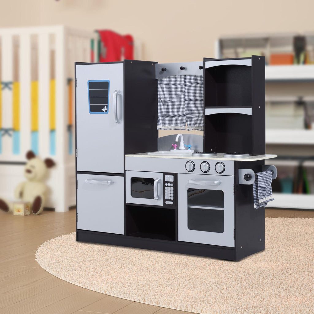 Verfügt über eine schwarz-graue Spielküche für Kinder mit Kühlschrank und Mikrowelle
