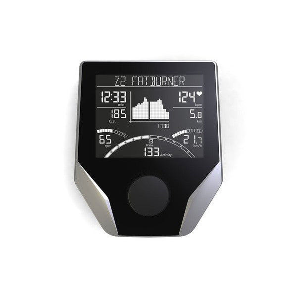 - Kontinuierliche Anzeige der einstellbaren Funktionen (Zeit, Strecke, Geschwindigkeit, Drehzahl, Kalorienverbrauch, Watt und Herzfrequenz) sowie einer grafischen Matrix zur Anzeige des Trainingstracks.