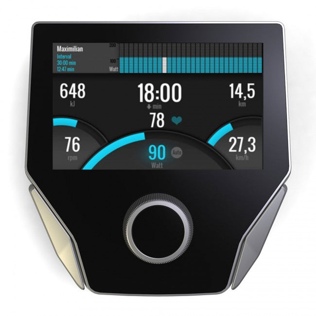 Hochauflösender Farb-LCD-Computer, mit integrierter Bluetooth-Schnittstelle, Multi-Informationen in Premium-Qualität, einfache Bedienung durch intuitive Menüführung, Speichermöglichkeit von vier Benutzern + einem Gast, Anzeige der aktuellen Herzfrequenzzone, kontinuierliche Anzeige für Funktionen (Zeit, Distanz , Geschwindigkeit, Drehzahl, Kalorienverbrauch, Watt und Herzfrequenz) einstellbar plus grafische Matrix zur Anzeige der Trainingsstrecke.