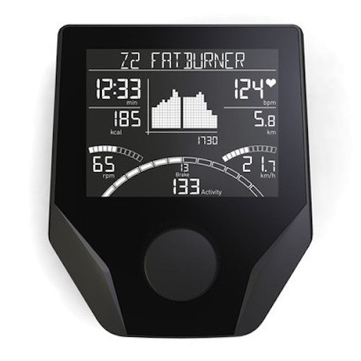 Hochauflösender Multi-Informations-LCD-Computer in Premium-Qualität, einfach zu bedienen mit intuitivem Navigationsmenü, Speichermöglichkeit für vier Benutzer + einen Gast, Anzeige der aktuellen Herzfrequenzzone, 10 voreingestellte Programme. Daueranzeige für 6 einstellbare Funktionen (Zeit, Strecke, Geschwindigkeit, Drehzahl, Kalorienverbrauch und Herzfrequenz) und mit Fitnesstest mit Schlussabstimmung plus Grafikmatrix zur Anzeige der Trainingsstrecke, 7 Sprachen einstellbar.