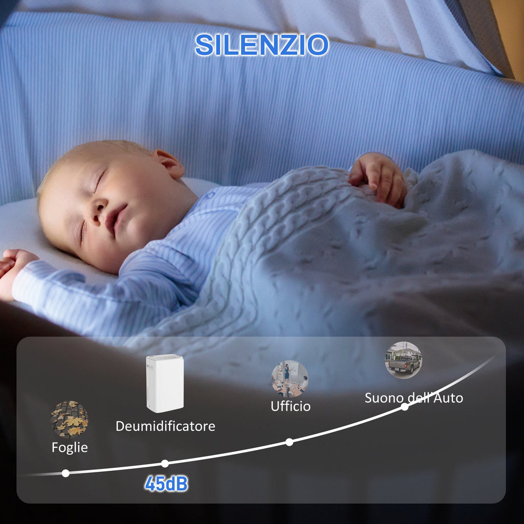 - TIMER ACCENSIONE/SPEGNIMENTO E AUTO-SPEGNIMENTO: Il deumidificatore per camere da letto ha un timer di 24 ore, ideale per programmare il dispositivo secondo i tuoi orari. Dotato di segnale luminoso e spegnimento automatico al riempimento del serbatoio dell'acqua, evita il rischio di fuoriuscita dell'acqua, per utilizzarlo in totale sicurezza