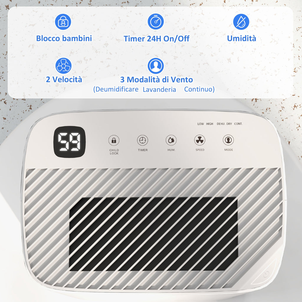 - IMPOSTAZIONI VERSATILI: Il nostro deumidificatore ambientale offre due velocità del ventilatore e tre modalità operative, includendo Deumidificare, Lavanderia e Funzionamento continuo, con umidità regolabile per adattarsi alle tue esigenze. Il display LED e i comandi touch rendono il suo utilizzo estremamente pratico
