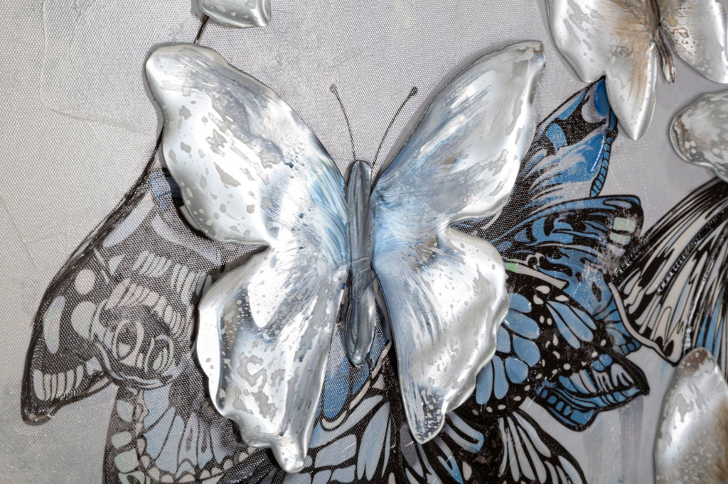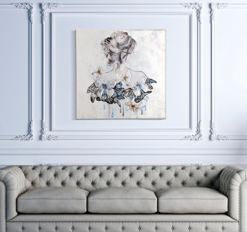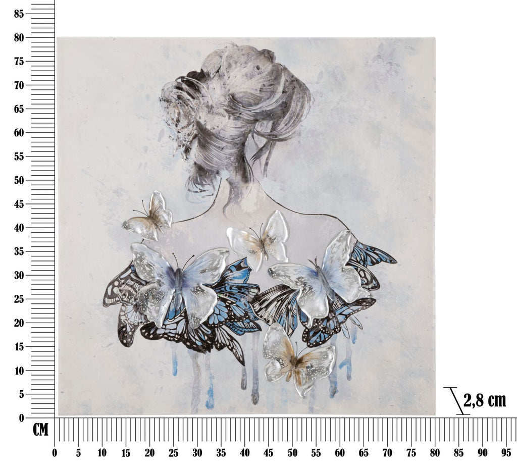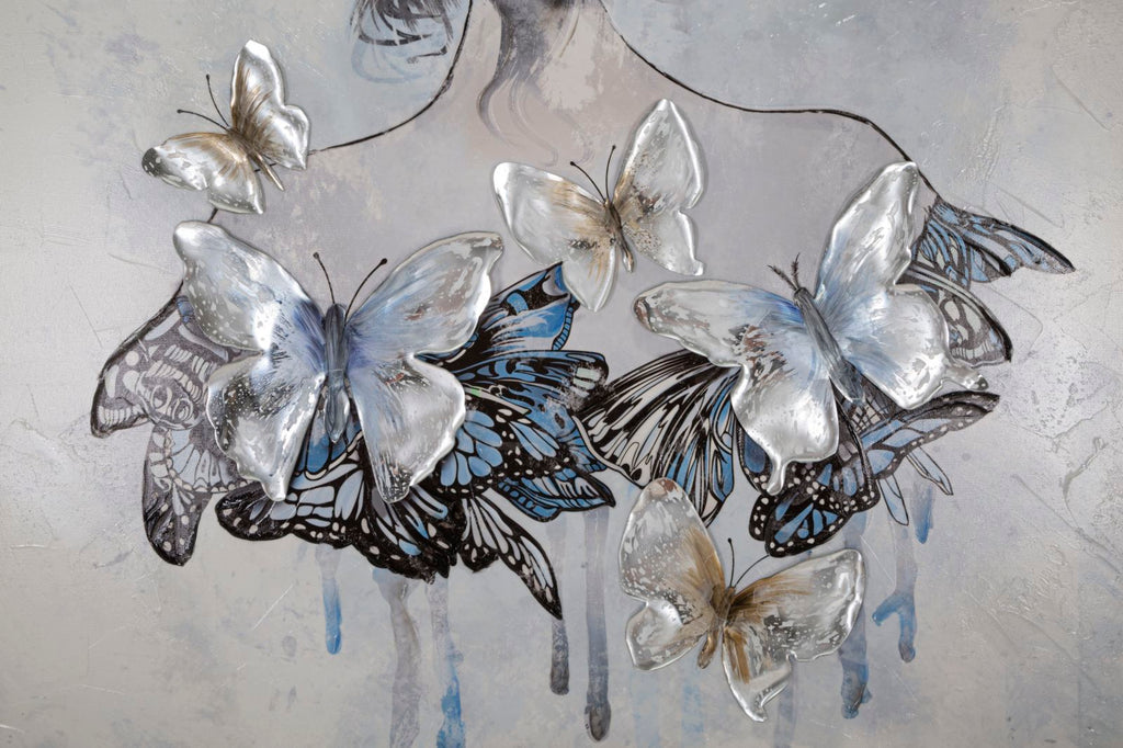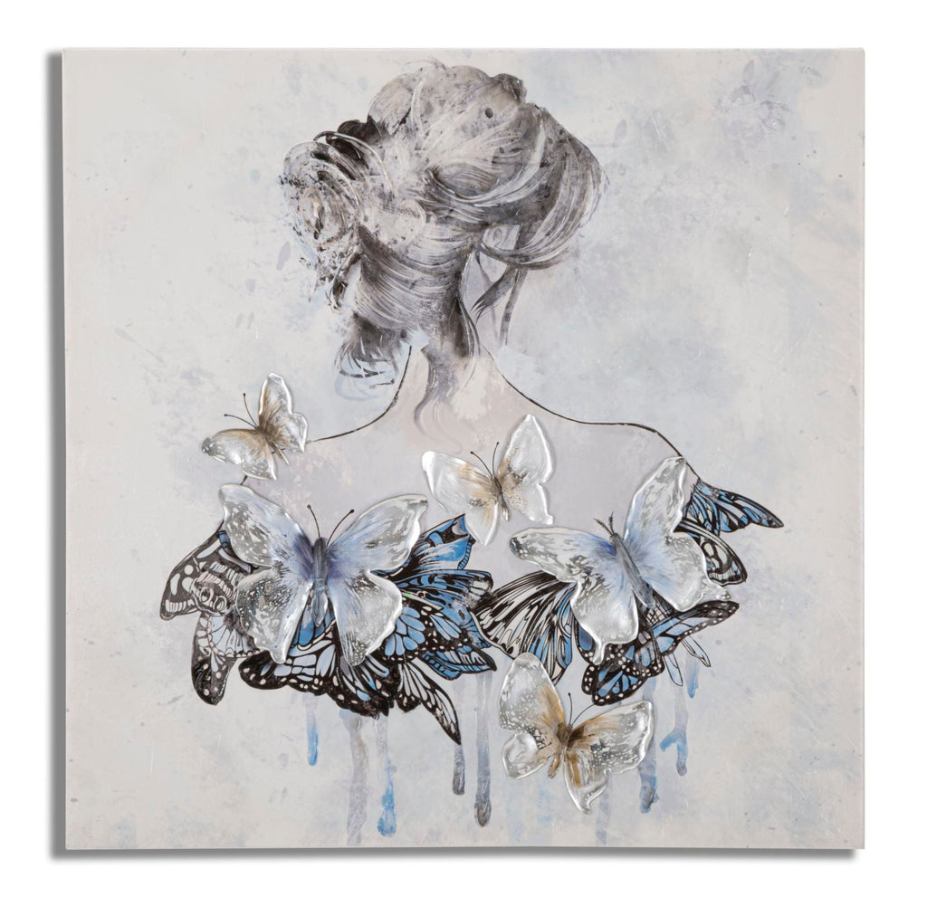 Questa rappresentazione pittorica su tela con un telaio in legno mostra una figura femminile di spalle. Il vestito della donna è molto particolare, infatti è composto interamente da farfalle in rilievo che creano un effetto tridimensionale. Questa scelta artistica conferisce un'aura di leggerezza e delicatezza all'opera, mettendo in evidenza l'eleganza e la bellezza dello stile della donna. L'uso dei colori e dei dettagli delle farfalle dona un tocco di vivacità e dinamicità all'intera composizione.