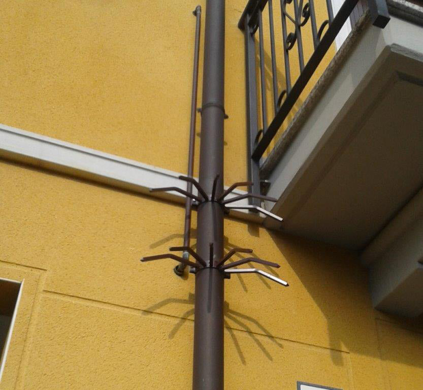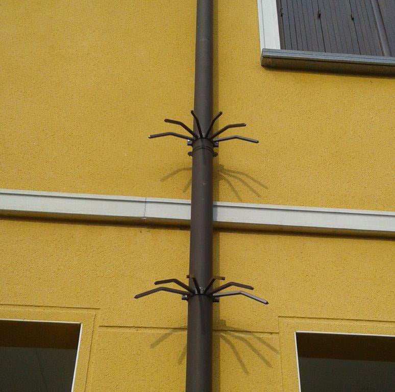 Diebstahlsicherung gegen allgemeine Rohrdiebstähle und Gasleitungen, für Rohre mit einem Durchmesser von 100 mm. Ausgezeichnetes Hindernis gegen Diebstähle, die durch Herunterklettern von Rohren oder Rohren im Allgemeinen durchgeführt werden. In der Praxis wird der Angreifer durch die spitzen Stangen behindert, die ihm nicht erlauben, seine Aktion fortzusetzen.