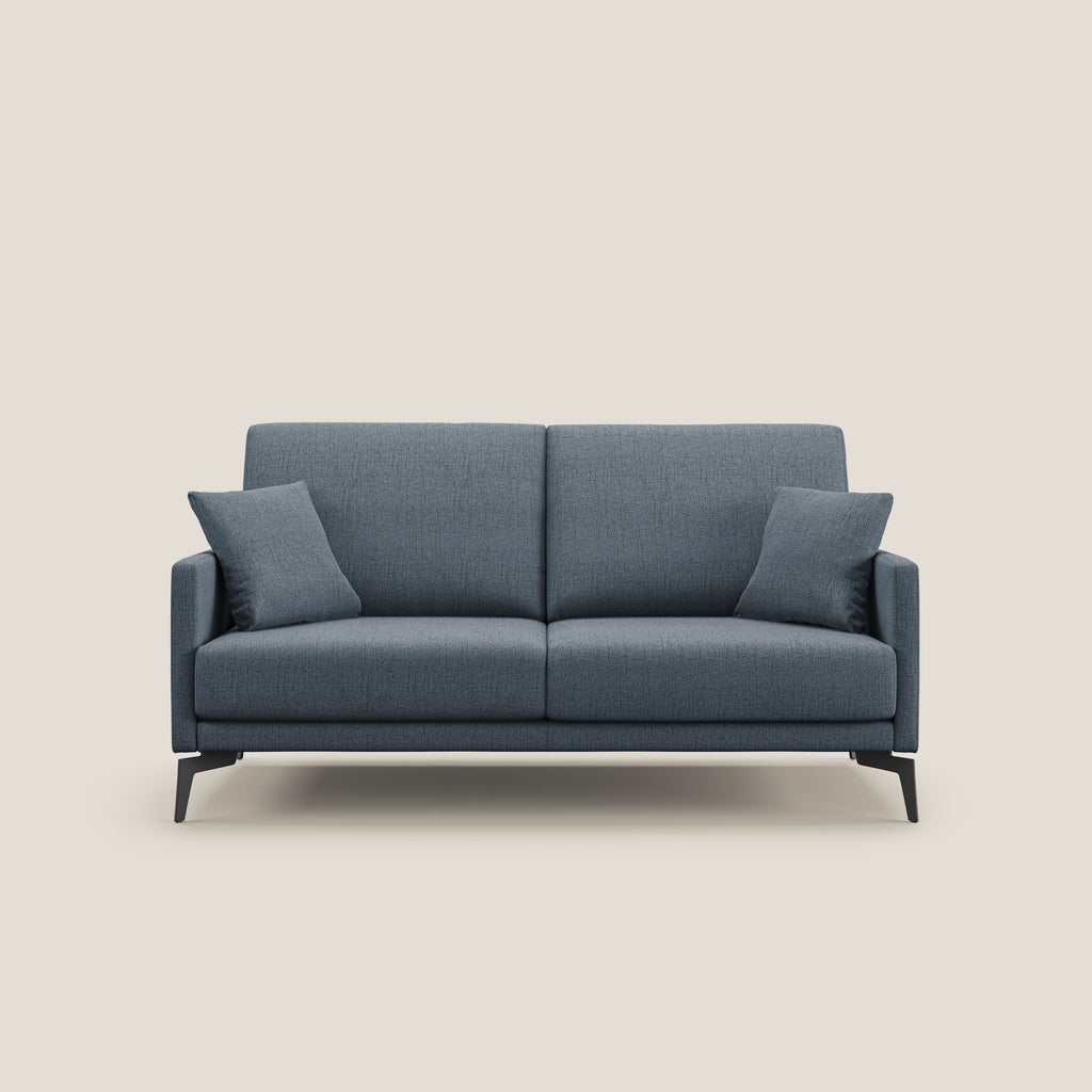 Il divano è realizzato in morbido tessuto impermeabile, dotato di piedini in acciaio nero alti 17 cm. È completamente sfoderabile e disponibile in 11 colori e diverse misure, adattandosi a ogni esigenza di spazio e design. Questo divano, prodotto al 100% in Italia, si distingue per la sua pregiata manifattura artigianale e per l'utilizzo di materiali di qualità, selezionati con attenzione e nel pieno rispetto dell'ambiente. Il tessuto water-repellent, facilmente lavabile in lavatrice a 30°, è ribattuto e cucito con una doppia lavorazione che evidenzia l'eccellenza della lavorazione sartoriale. Il divano offre inoltre una facile sfoderabilità totale, grazie alla quale è possibile mantenerlo sempre pulito e in ordine. La seduta e lo schienale, realizzati con materiali ad alta densità e indeformabili, garantiscono un elevato comfort. In sintesi, il divano rappresenta un mix di eleganza, funzionalità e qualità artigianale.