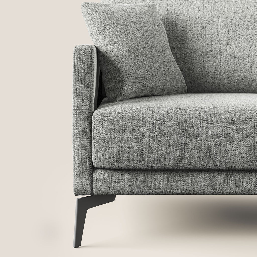 Il divano è disponibile in tessuto morbido ed impermeabile, con piedini in acciaio nero alti 17 cm. È completamente sfoderabile e può essere scelto tra 11 colori e diverse misure per adattarsi a ogni esigenza di spazio e design. Questo divano, 100% made in Italy, è caratterizzato dalla ricercata manifattura artigianale italiana che si manifesta nella selezione accurata di materiali di qualità rispettosi dell'ambiente, nel tessuto water-repellent facile da pulire e lavabile in lavatrice a 30°, nella ribattitura del tessuto cucito che esalta il pregio della lavorazione sartoriale, nella facile sfoderabilità totale e nell'alta densità dei materiali della seduta e dello schienale in HR indeformabile. Il modello offre tutto questo.