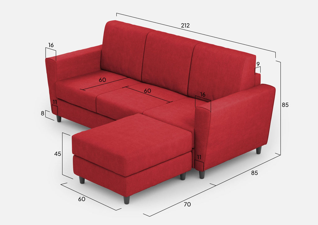 Divano 3 Posti con Pouf 212x155x85 cm Yasel in Tessuto Rosso