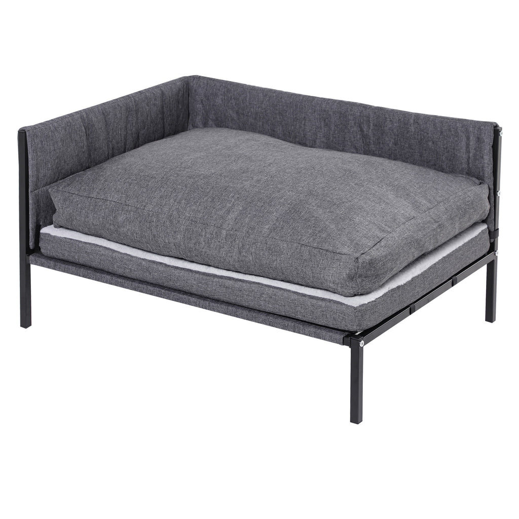 Schaffen Sie eine gemütliche Ecke, in der sich Ihr Hund für ein Nickerchen einkuscheln kann! Diese Hundehütte ist für Haustiere bis 35 kg konzipiert und bietet ihnen allen Komfort, den sie brauchen. Es hat gepolsterte Kissen, die mit grauem Polyester bezogen sind, sehr weich und perfekt zum Entspannen. Die Struktur besteht aus schwarz lackiertem Stahl und ist erhöht: Dies begünstigt die Luftzirkulation und hält Ihren großen Hund immer kühl.