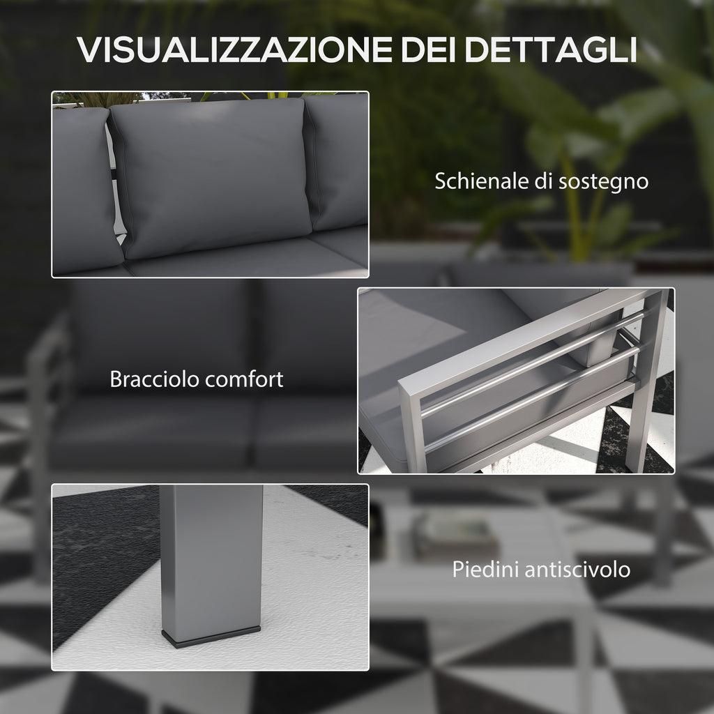 Trasforma il tuo spazio esterno in un accogliente rifugio con il divano da giardino ! Questo elegante arredo da esterno ospita comodamente 3 persone, combinando un'elegante struttura in alluminio con morbidi cuscini, rendendolo un riferimento per il relax e lo stile. I cuscini della seduta da 7 cm e dello schienale da 9 cm di spessore, completi di cerniere per una facile pulizia, offrono un sostegno di qualità durante le chiacchierate in compagnia nei tuoi spazi.