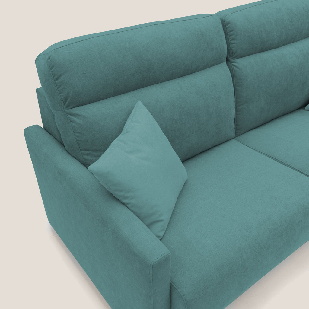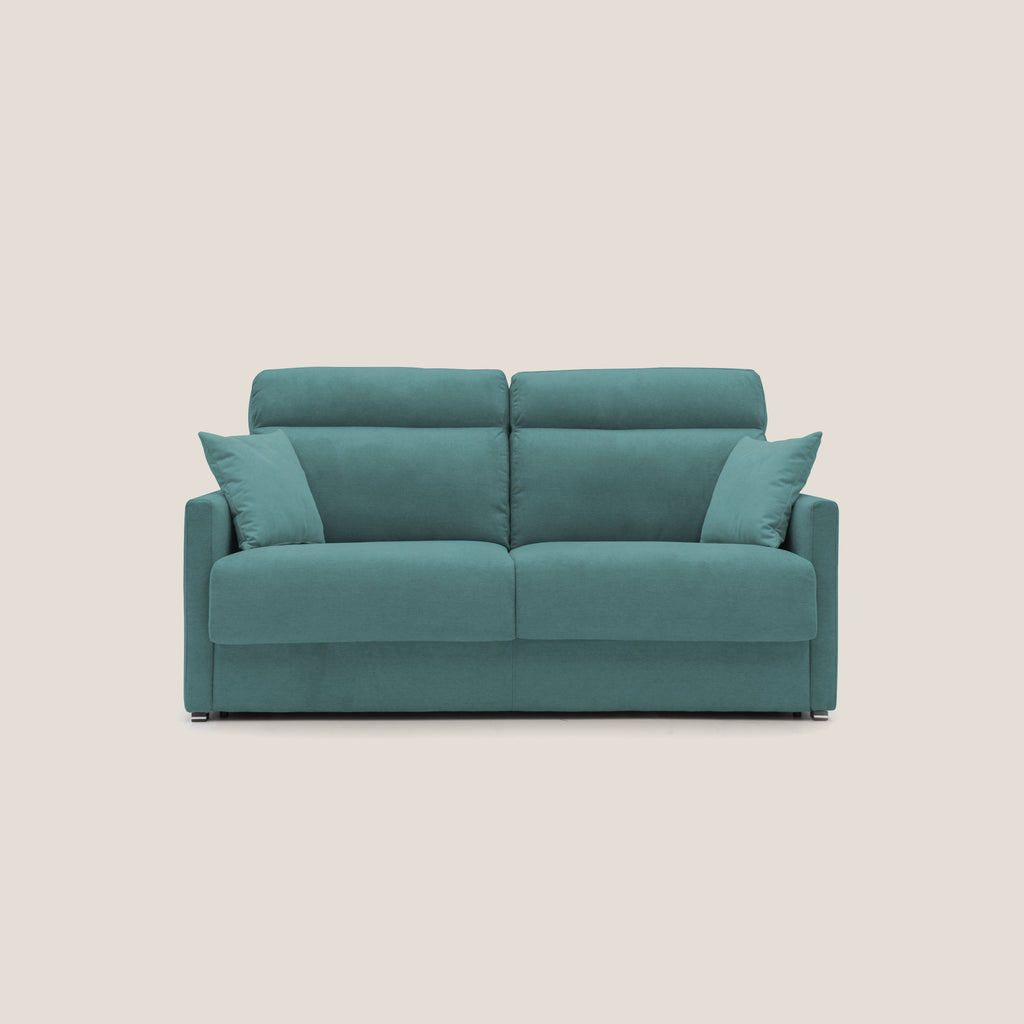 Il divano letto è caratterizzato da un alto schienale in morbido fiocco che garantisce un elevato livello di comfort, perfetto anche per appoggiare la testa. Realizzato in versione 3 posti o 2 posti, con tessuto morbido ed impermeabile, piedini in legno wengè e profilo cromato. Disponibile in 12 colori e diverse misure, il divano si adatta a ogni esigenza di spazio e design. Grazie al suo schienale alto e ampio, il divano offre il massimo del comfort in ogni situazione, sia per un sonnellino durante il giorno che per una serata rilassante con gli amici. La seduta confortevole, con doppia densità, offre il giusto sostegno al corpo, mentre lo schienale in fiocchi di fibre esalta la sua morbidezza, offrendo una sensazione avvolgente di comfort.