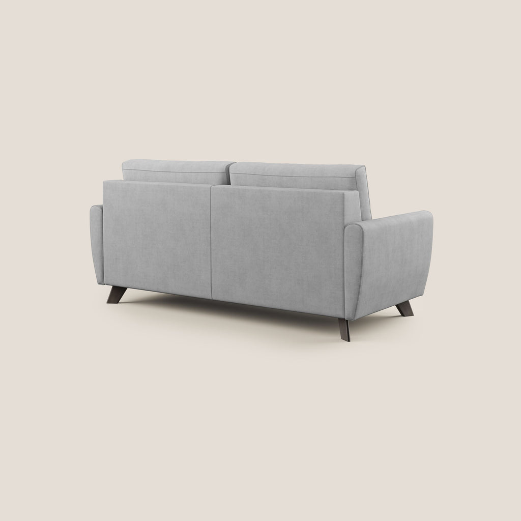 Il divano letto è caratterizzato da linee morbide e confortevoli, con uno schienale imbottito artigianalmente che rappresenta una moderna interpretazione del classico divano capitonnè. I piedini in legno si adattano perfettamente a uno stile scandinavo e shabby. Il meccanismo a ribalta offre un piano di dormita elettrosaldato, ma può essere realizzato anche con un piano a doghe in faggio. Materasso incluso ad alta densità di 14 cm, anallergico ed ergonomico, realizzato in poliuretano espanso densità 28 kg/m3, rivestito in tessuto elasticizzato. Super traspirante, con una striscia 3D che garantisce un costante ricircolo dell'aria mantenendola sempre climatizzata e rilasciando l'umidità in eccesso, è vestita da un rivestimento trapuntato in tessuto bianco anallergico e antibatterico. Il terminale in cinghie elastiche contribuisce a rendere la seduta più morbida ed accogliente una volta chiuso il divano. Il tessuto impermeabile e antimacchia rende la pulizia facile, mentre il trattamento idrorepellente consente una manutenzione veloce e precisa del prodotto, incluso il lavaggio in lavatrice a 30°.