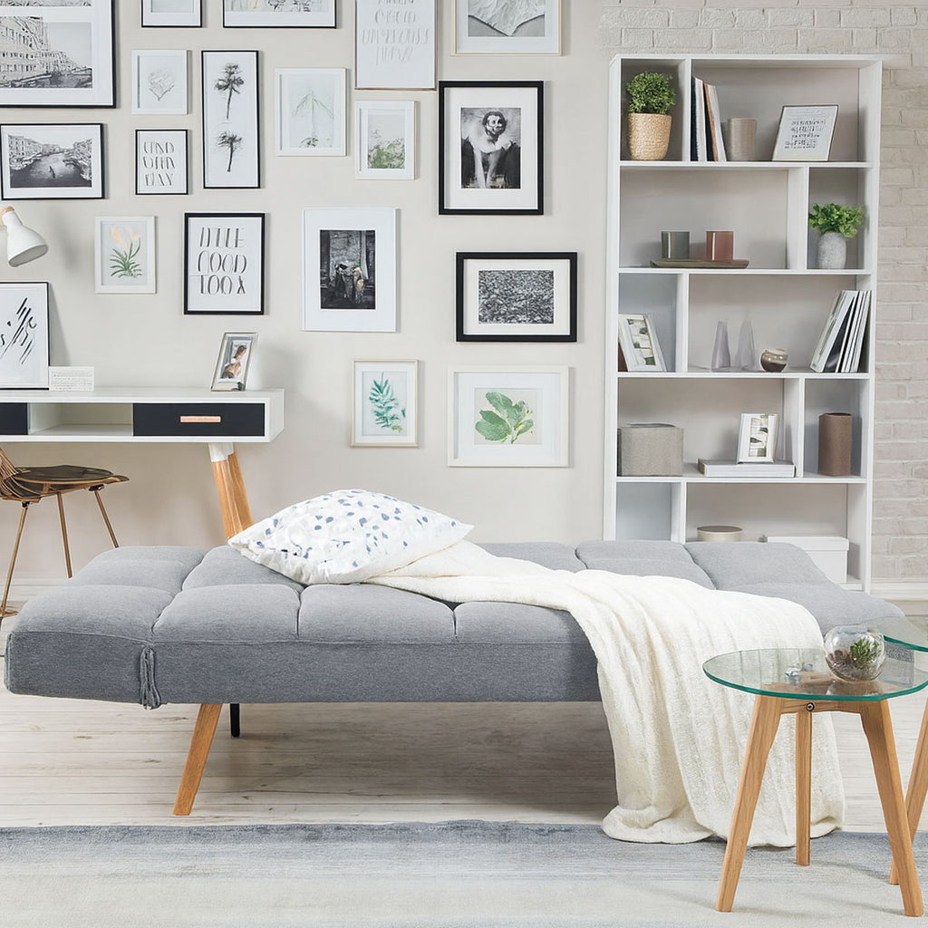 Realizzato con un resistente rivestimento in tessuto e un'imbottitura in schiuma espansa ad alta densità, questo divano letto assicura un comfort ottimale sia come divano che come letto. La solida struttura in metallo e legno di eucalipto garantisce stabilità e durata nel tempo. I braccioli regolabili offrono un ulteriore livello di comfort personalizzabile.