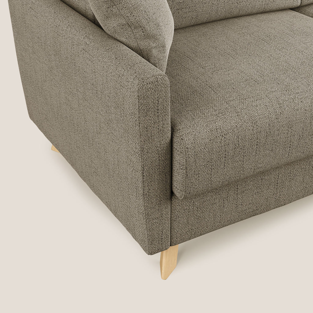 Il divano letto è disponibile in versione da 3 posti e da 2 posti, realizzato in tessuto impermeabile ed antimacchia. Grazie alle sue linee contemporanee e intramontabili, si adatta a qualsiasi spazio e design. Il divano è caratterizzato da un rivestimento lavabile anche a 30°, dotato di un vano porta cuscini nello schienale e piedini in legno naturale alti 13 cm. Questa soluzione offre un mix di leggerezza ed eleganza ed è ideale sia per ambienti contemporanei e moderni, che per spazi ispirati a una visione naturale o al design scandinavo.