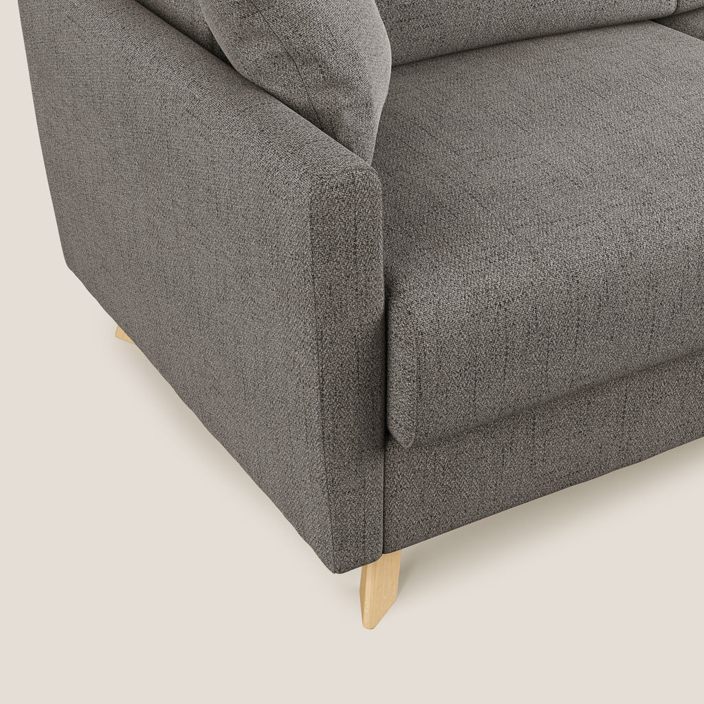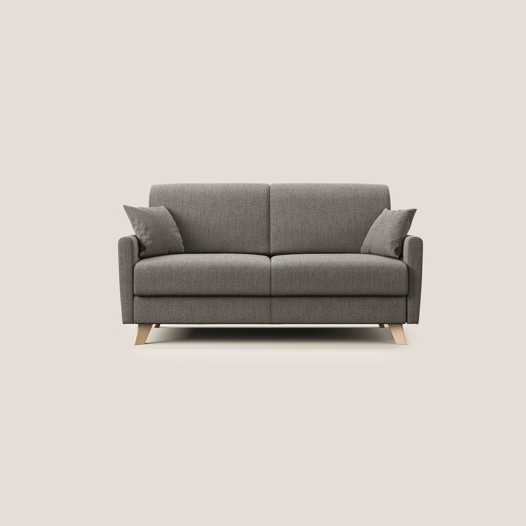 Il divano letto è disponibile in versione da 3 posti e da 2 posti, realizzato in tessuto impermeabile ed antimacchia. Grazie alle sue linee contemporanee e intramontabili, si adatta a qualsiasi spazio e design. Il divano è caratterizzato da un rivestimento lavabile anche a 30°, dotato di un vano porta cuscini nello schienale e piedini in legno naturale alti 13 cm. Questa soluzione offre un mix di leggerezza ed eleganza ed è ideale sia per ambienti contemporanei e moderni, che per spazi ispirati a una visione naturale o al design scandinavo.