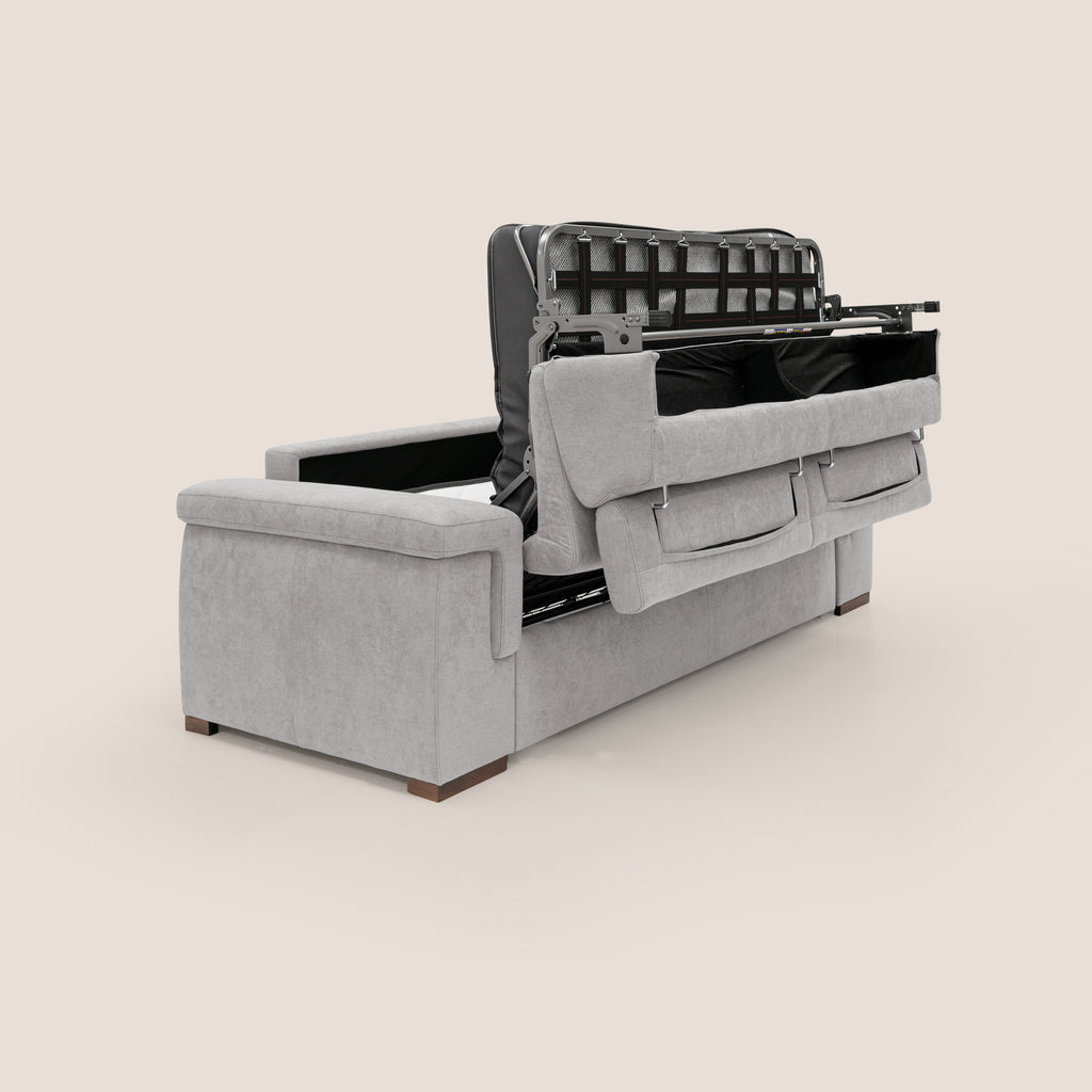 Il divano letto offre un design sofisticato e funzionale grazie ai braccioli che fungono da comodo supporto per il capo durante i momenti di relax. Il piano per dormire è rinforzato da una robusta rete elettrosaldata che include un materasso comfort alto 18 cm, garantendo solidità e funzionalità. La struttura del materasso è progettata per resistere alle sollecitazioni derivanti dall'apertura e chiusura del meccanismo del divano letto. Il materasso ad alta densità con fascia traspirante 3D offre comfort, praticità ed eleganza all'intero divano.