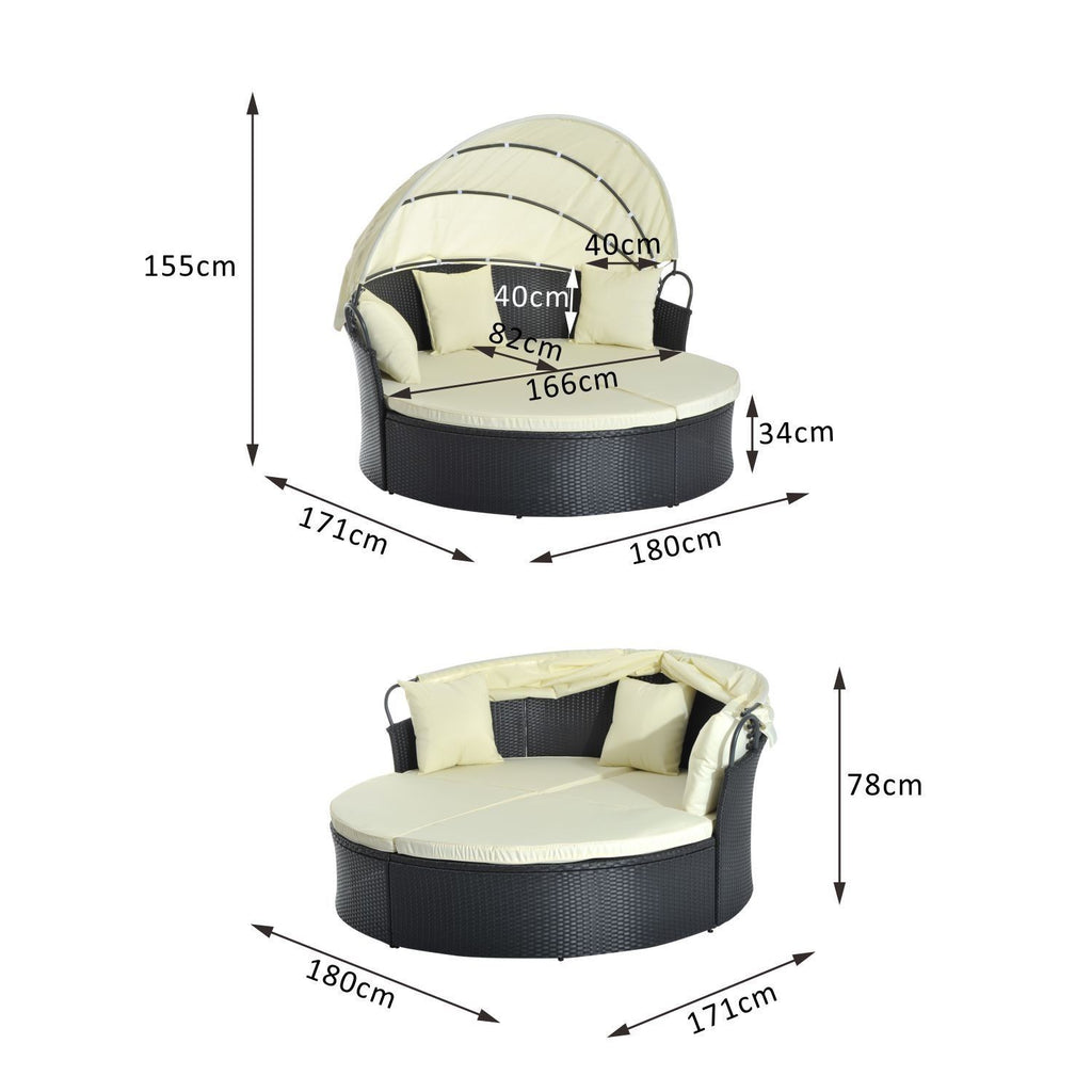 Shell Outdoor-Schlafsofa mit Fußstütze und Sonnenschirm aus schwarzem PE-Rattan