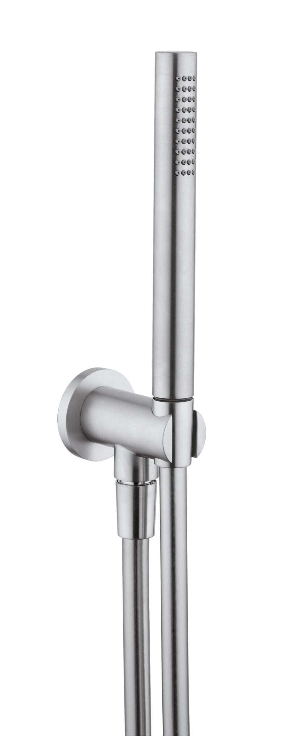 Set doccia in acciaio inox 316L, con doccetta e flessibile lungo 160cm, presa d'acqua con supporto doccia con connessione G1/2" e rosone da diametro 50mm. Nati per essere contemporanei, le superfici lisce e pulite fanno dei rubinetti Tevere un accessorio di design per spazi moderni