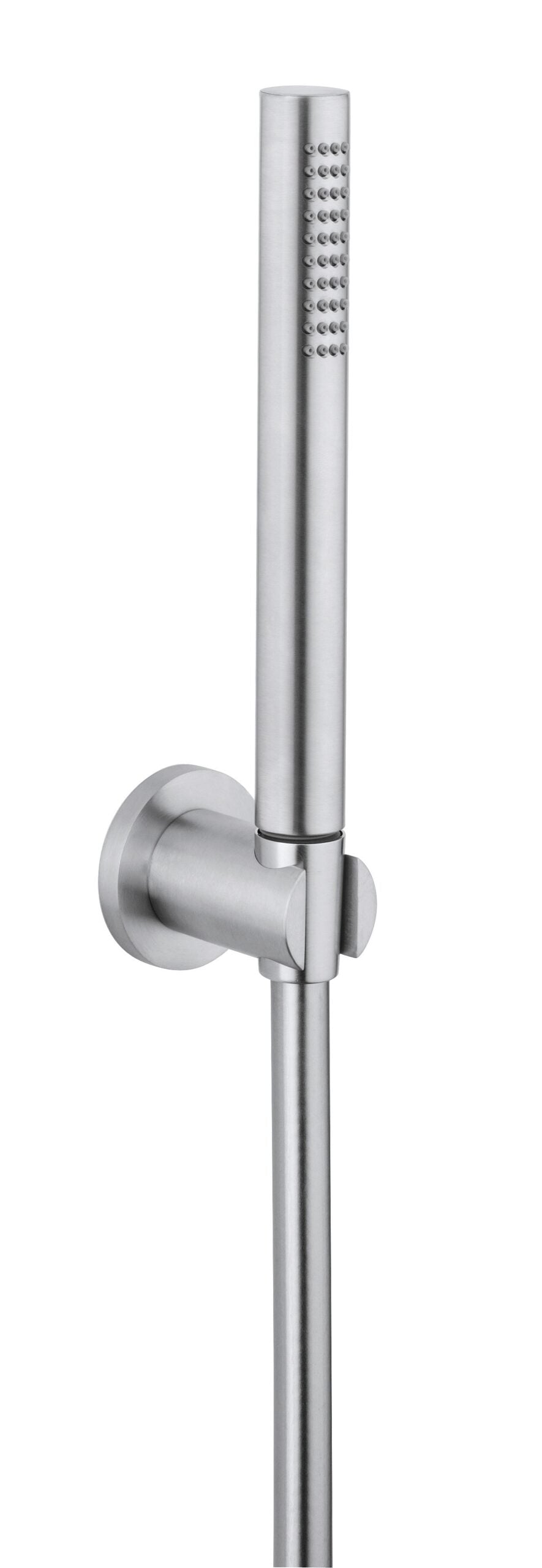 Set doccia in acciaio inox 316L, con doccetta e flessibile lungo 160cm, supporto doccia con connessione G1/2" e rosone da diametro 50mm. Nati per essere contemporanei, le superfici lisce e pulite fanno dei rubinetti Tevere un accessorio di design per spazi moderni