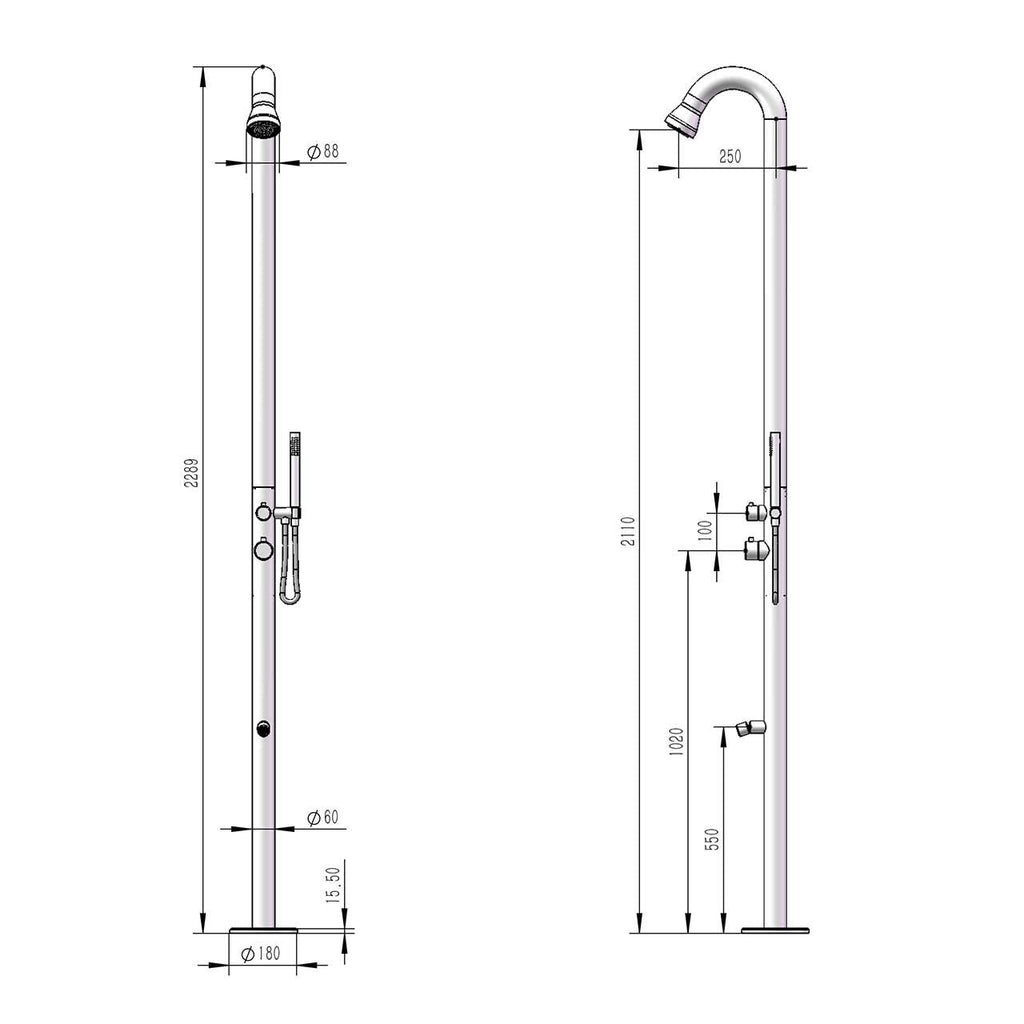 Gartendusche 228,9x18x25 cm mit Sined Bosa Inox Handbrause und Fußwascher