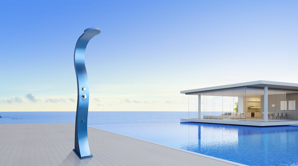 Garten-Pool-Dusche mit Warm-Kalt-Mischer und blauer Fußwaschanlage