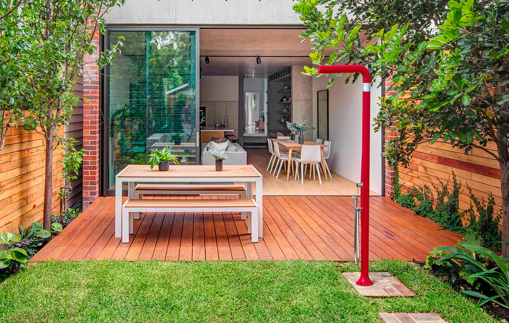 Questo tipo di doccia esterna ha l'attacco diretto alla linea principale dell'acqua calda e fredda.