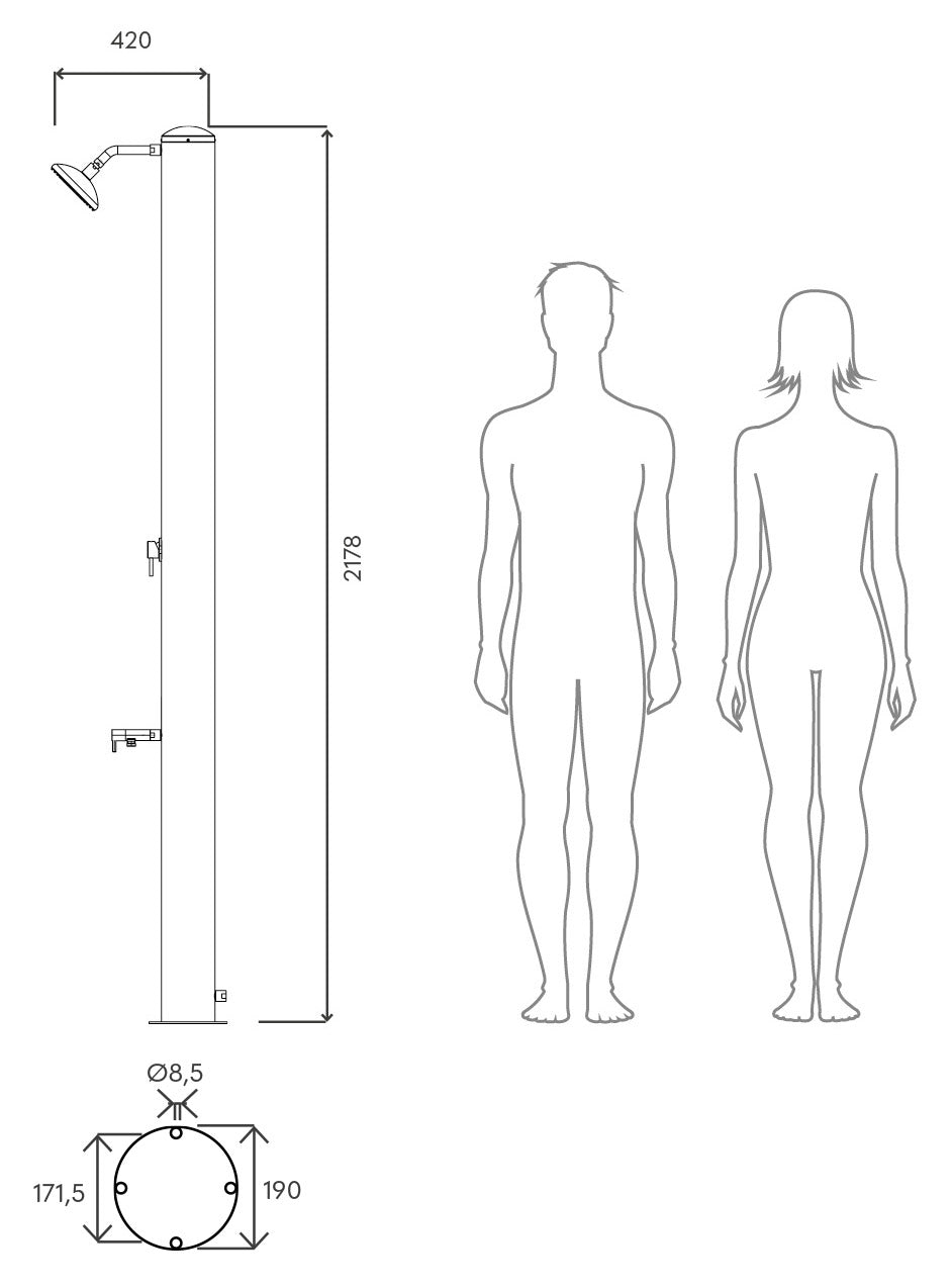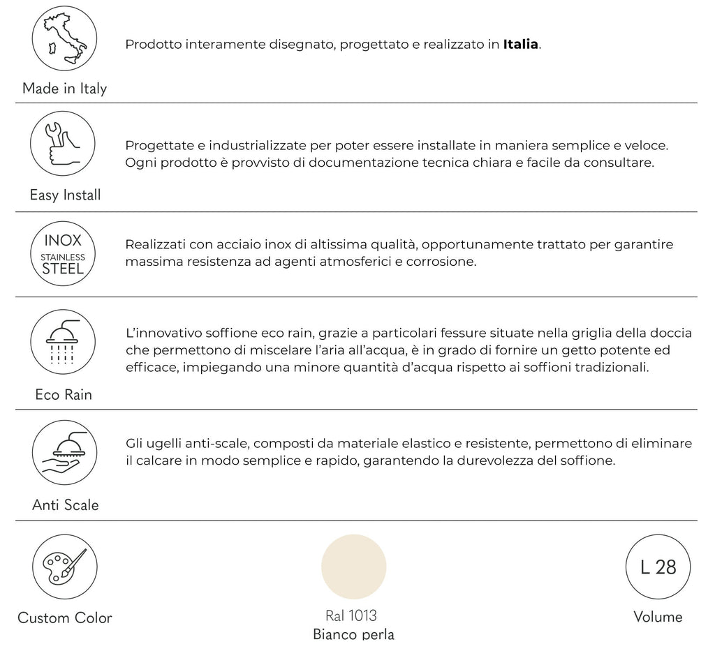 Compatta, dal design minimalista, la doccia Tevere si adatta perfettamente a tutti gli ambienti e necessita di pochissimo spazio per l’installazione. Si compone di un tubo solare in acciaio inox con verniciatura bianco perla. Le parti idrauliche, realizzate in metallo nobile, sono opportunamente studiate e trattate per uso esterno. Tra queste, l’innovativo soffione con morbidi ugelli gommati che rendono semplicissima e veloce l’eliminazione del calcare, allungando sensibilmente il ciclo di vita del componente. Il soffione a risparmio energetico “eco rain”, grazie a particolari fessure situate nella griglia della doccia, miscela l’aria all’acqua, fornendo un getto potente ed efficace ed impiegando una minore quantità d’acqua. In una giornata soleggiata, Tevere regalerà fino al calar della sera il piacere dell’avvolgente tepore dell’acqua, riscaldata dai raggi solari.