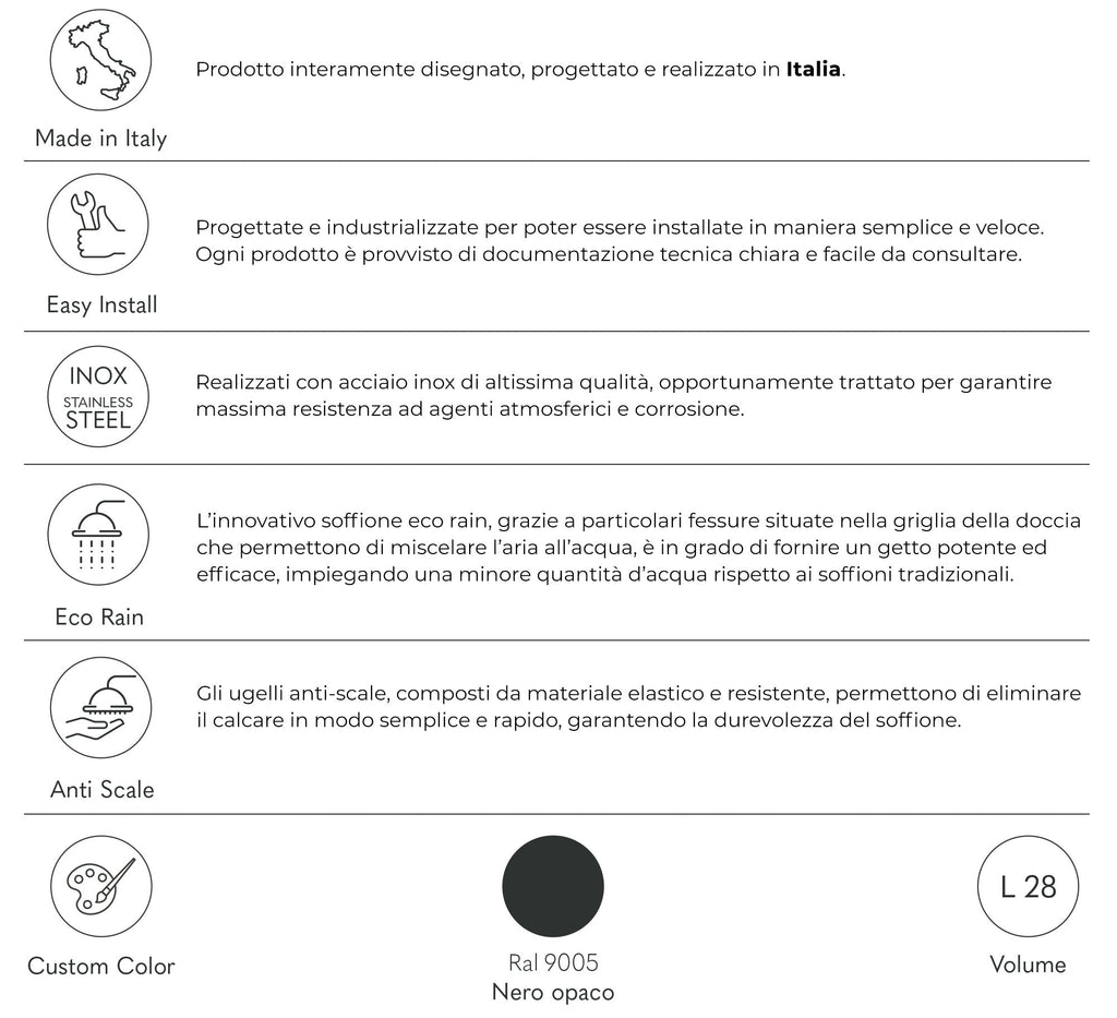 Compatta, dal design minimalista, la doccia Tevere si adatta perfettamente a tutti gli ambienti e necessita di pochissimo spazio per l’installazione. Si compone di un tubo solare in acciaio inox con verniciatura nero opaco. Le parti idrauliche, realizzate in metallo nobile, sono opportunamente studiate e trattate per uso esterno. Tra queste, l’innovativo soffione con morbidi ugelli gommati che rendono semplicissima e veloce l’eliminazione del calcare, allungando sensibilmente il ciclo di vita del componente. Il soffione a risparmio energetico “eco rain”, grazie a particolari fessure situate nella griglia della doccia, miscela l’aria all’acqua, fornendo un getto potente ed efficace ed impiegando una minore quantità d’acqua. In una giornata soleggiata, Tevere regalerà fino al calar della sera il piacere dell’avvolgente tepore dell’acqua, riscaldata dai raggi solari.