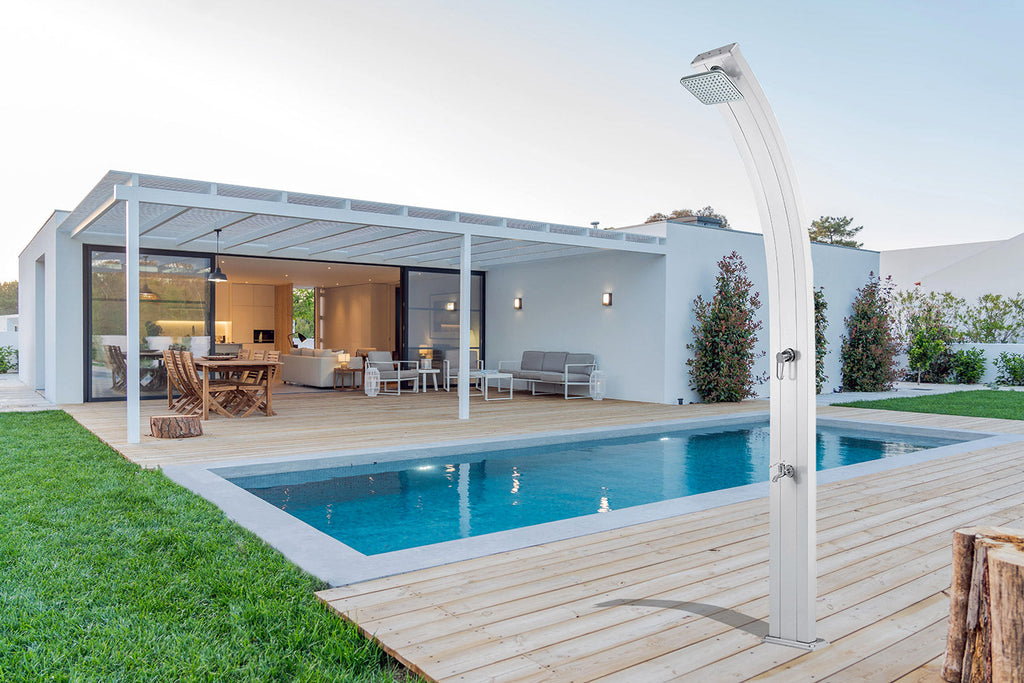 Das zeitgemäße Design dieser Solardusche fügt sich perfekt in jeden Garten oder jede Terrasse ein. Vollständig in Aluminium und/oder Edelstahl ausgeführt. Solarwärme reicht aus, um seinen großen 30-Liter-Tank zu beheizen, also ist er 100 % umweltfreundlich. Ihr geschwungenes Design, ihre Eleganz und ihre Leichtigkeit machen diese Dusche unverzichtbar für alle Außenbereiche. Schließen Sie es einfach an eine Wasserquelle an.