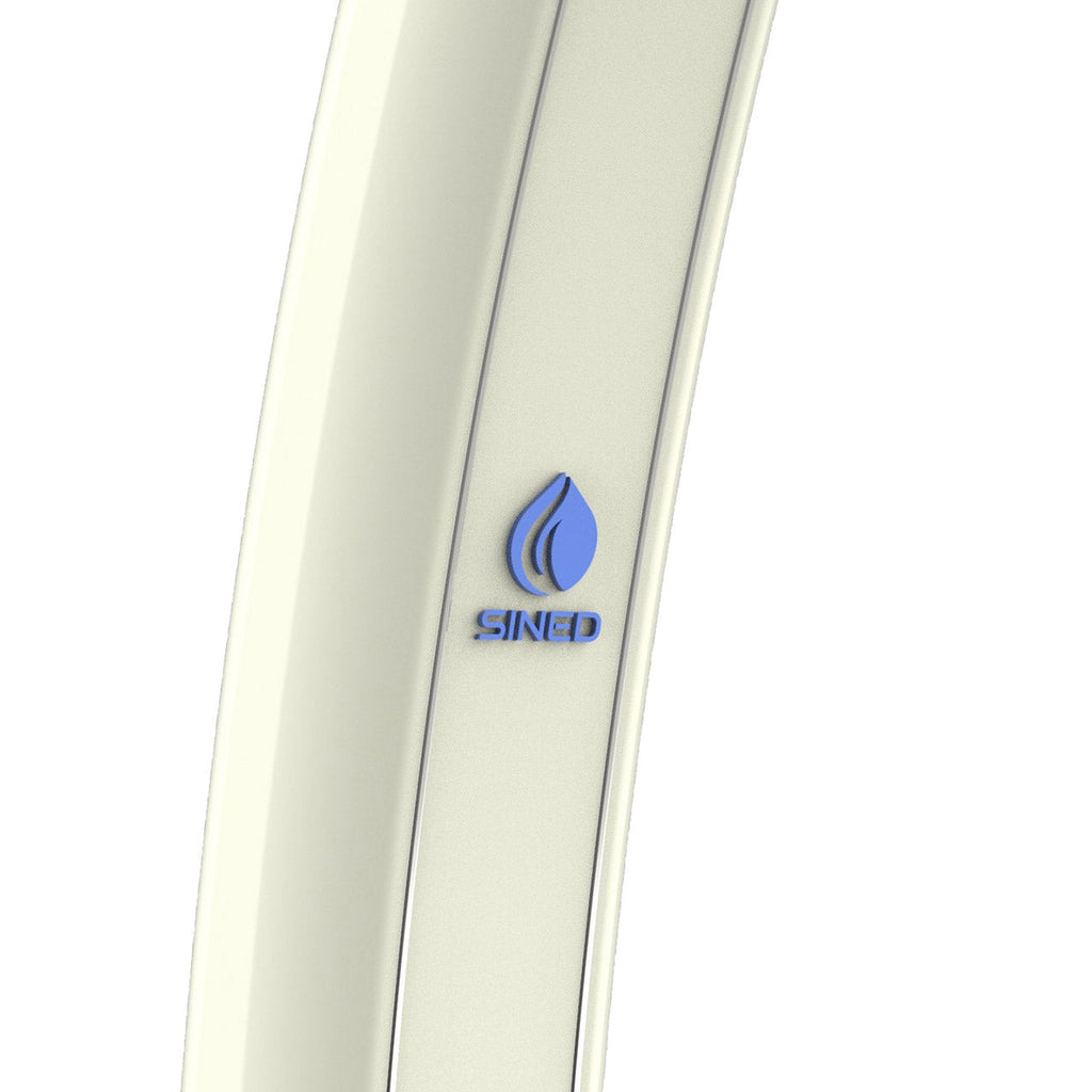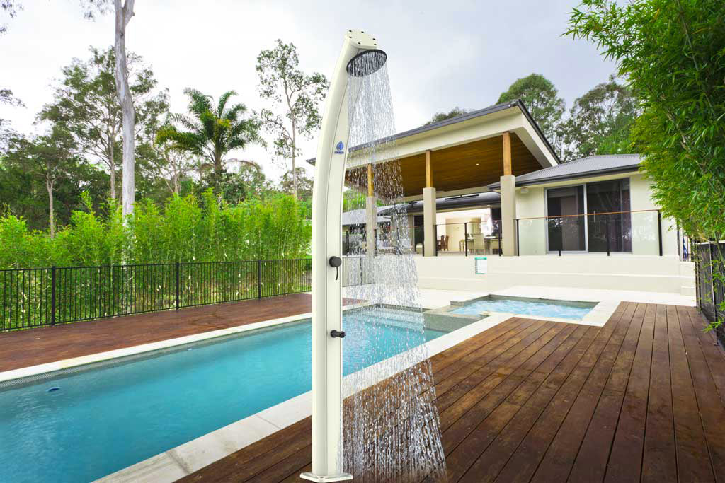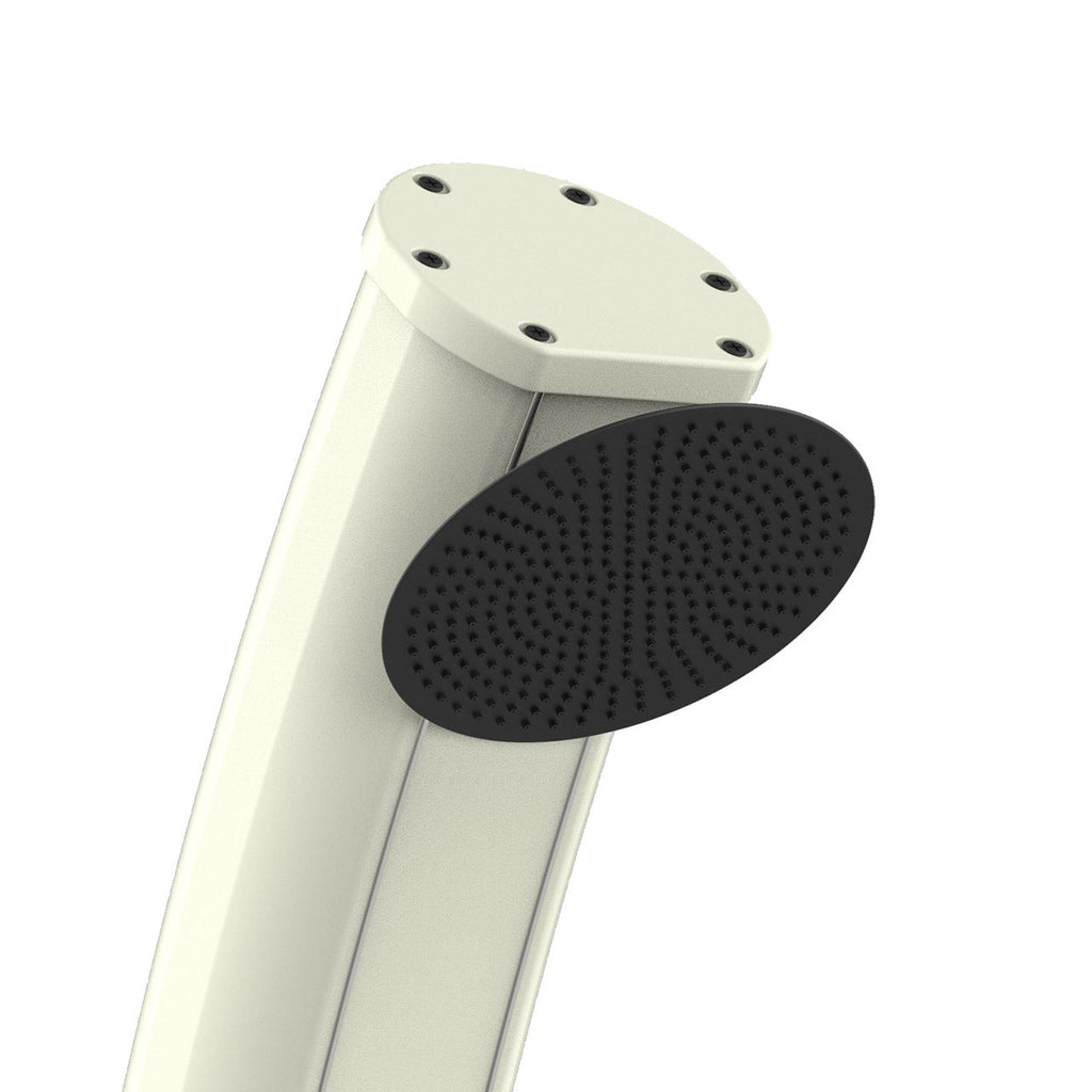 Sined DAFNE Weiße Ökologische Solardusche mit 20 cm rundem Duschkopf, Mischbatterie und Fußwaschhahn Dusche mit gebogener Aluminiumstruktur für den Außenbereich, 35-Liter-Tank, Höhe 226 cm. Geeignet für Pool, Garten, B&B, Hotels und Campingplätze.