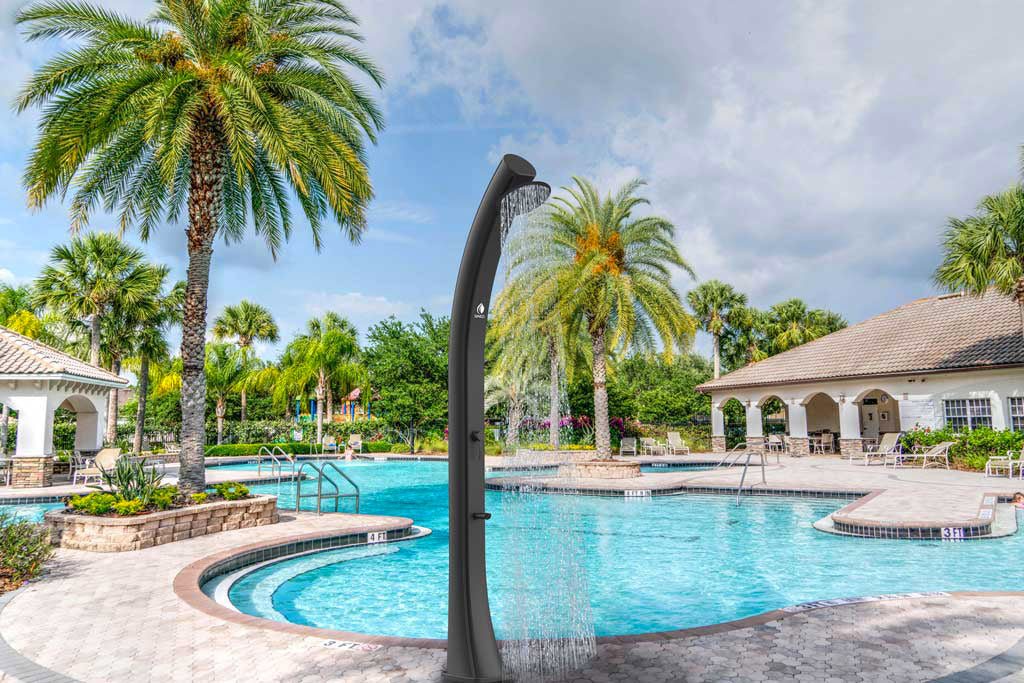 Schwarze solarbeheizte Dusche. Gebogener Körper aus HD-Polyethylen für Garten und Schwimmbad Höhe 226,6 cm. Ausgestattet mit einem runden Duschkopf mit 20 cm Durchmesser, einem 40-Liter-Tank und einem Fußwaschhahn. Accessoires aus mattschwarzem Messing. Kostenloser Kalkfilter und Duschabdeckung.