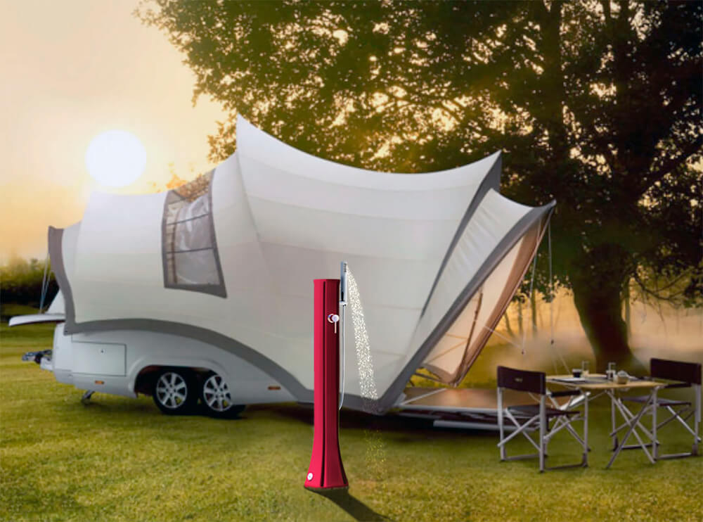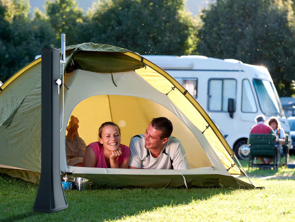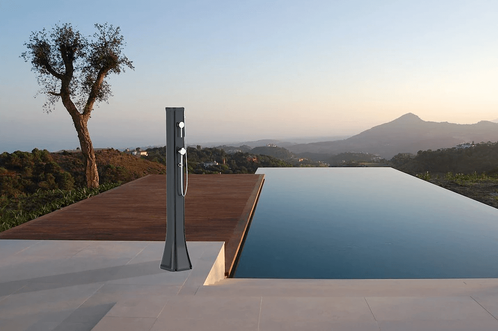 Outdoor- Solardusche mit innovativem und originellem Design , Happy Go mit Zerstäuber und mobiler Handbrause von ARKEMA .