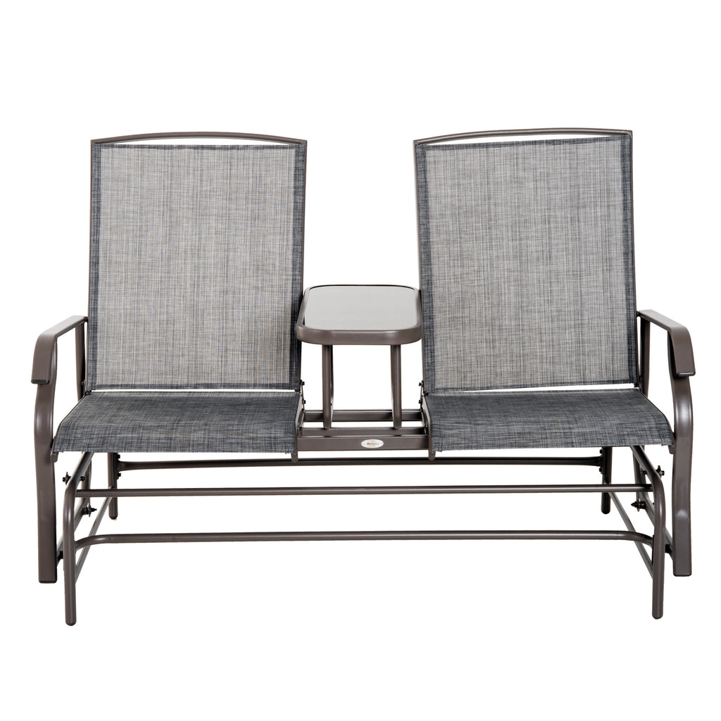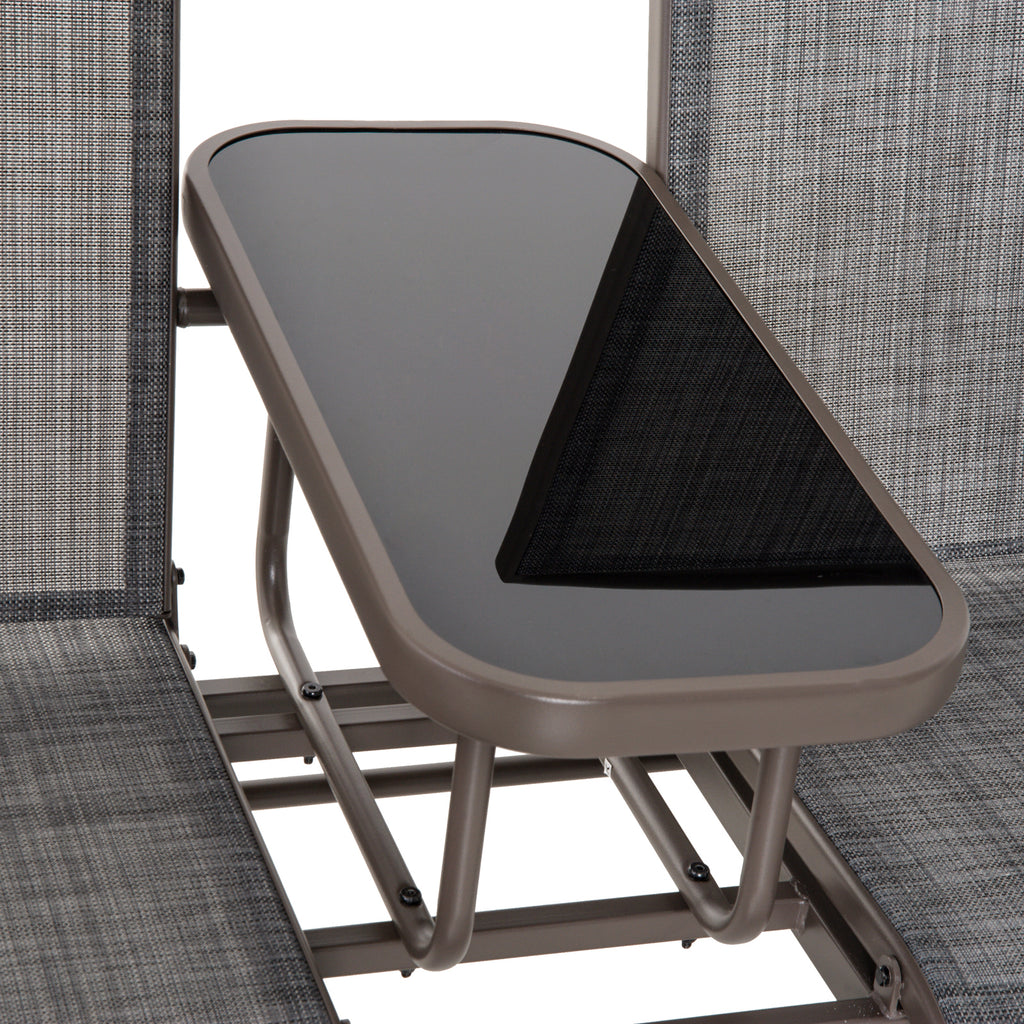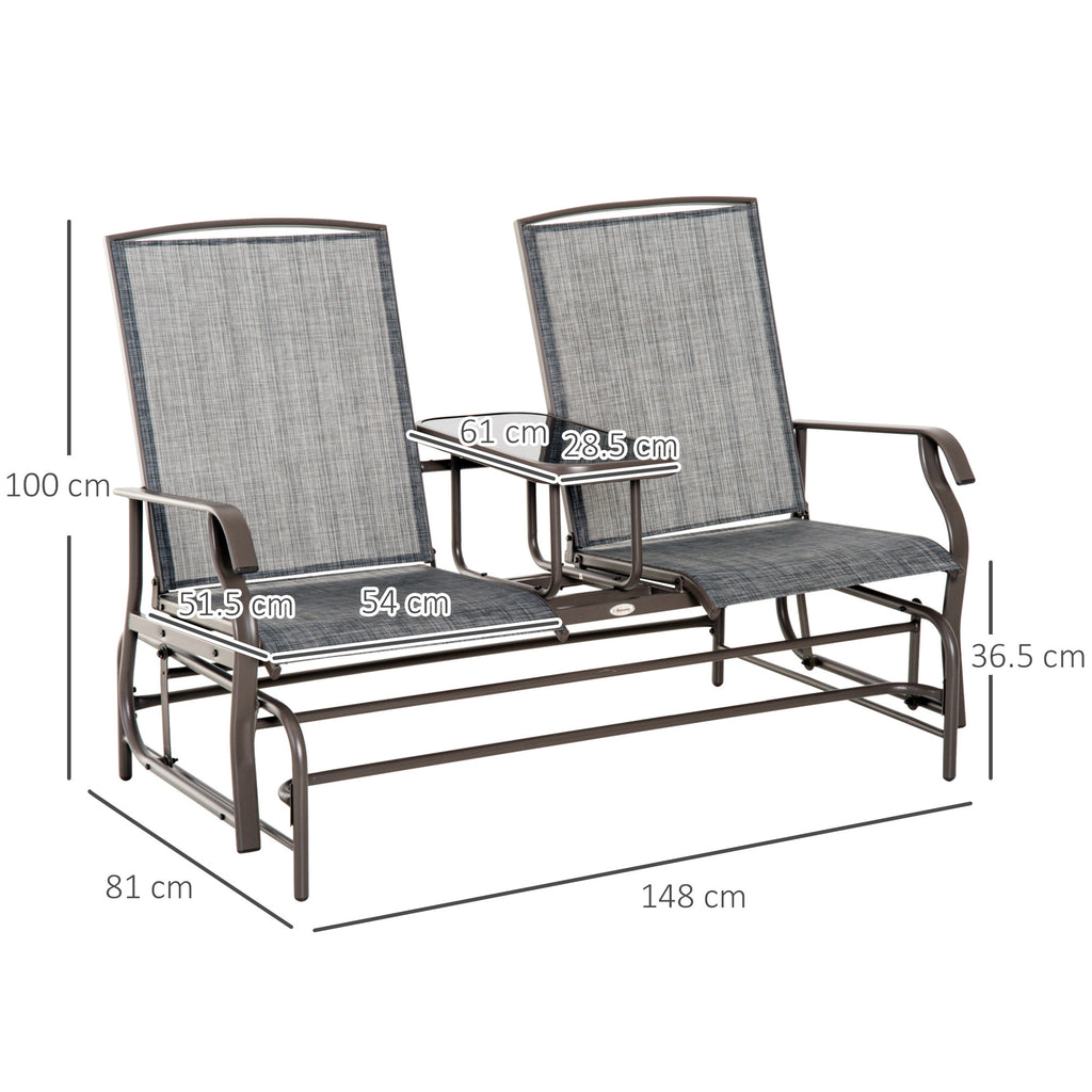 Die moderne und luxuriöse 2-Sitzer-Gartenschaukel ist das ideale Möbel für Ihre Freiflächen, dank der bequemen separaten Sitze können Sie das Leben genießen. 4 Arme sind mit einem stabilen Rahmen verbunden, um ein sicheres und reibungsloses Schwingen zu gewährleisten. Auf dem Couchtisch in der Mitte können Sie Obst, Milch, Kaffee, Tee oder andere Lebensmittel abstellen. Auf der Tischplatte ist gehärtetes schwarzes Siebdruckglas montiert. Wählen Sie es, um angenehme Momente der Entspannung in Gesellschaft zu genießen!