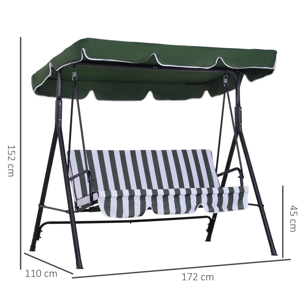 Swing 2+1-Sitzer Schaukelstuhl mit Stahlstruktur, Kissen und weiß/grünem 140 g/m2 Polyesterdach.