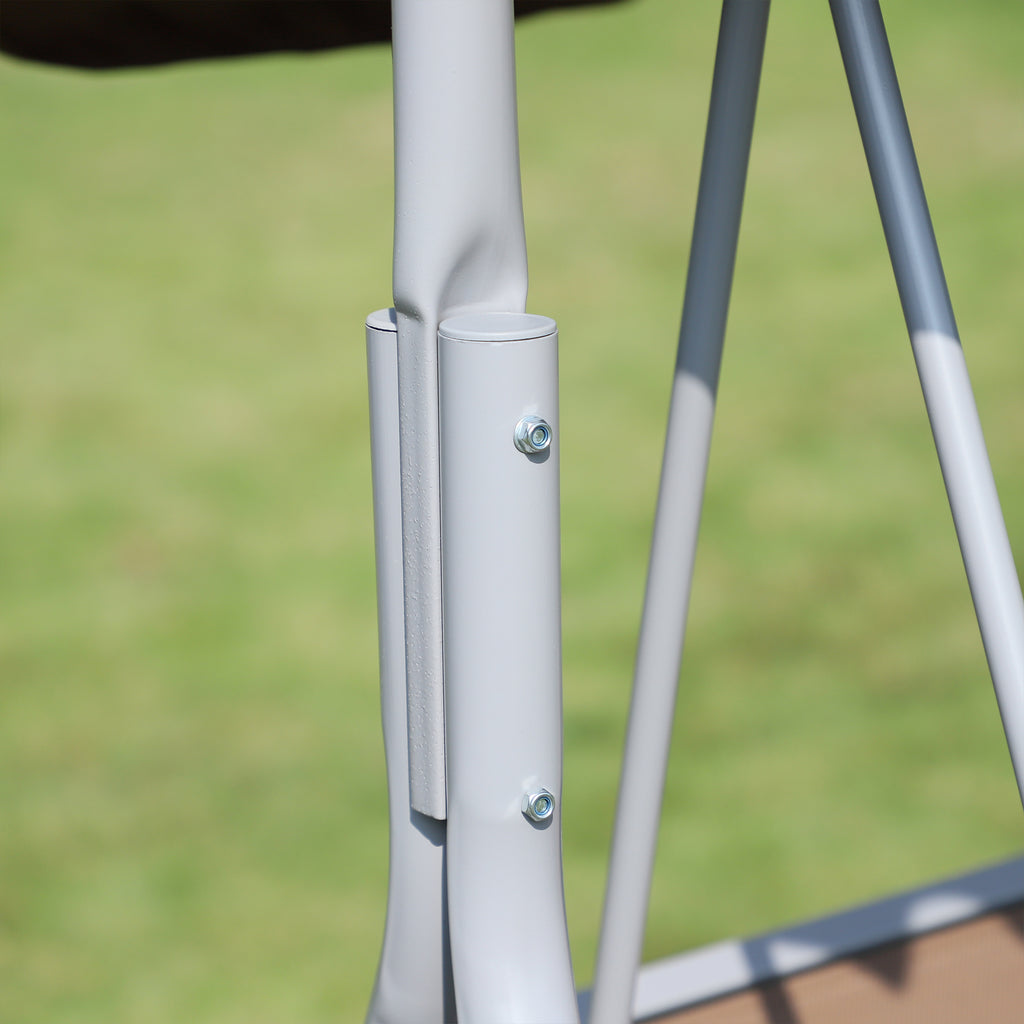 Es besteht aus Metall mit einem Sitz aus Sling-Stoff und hat auch ein UV-geschütztes Polyester-Verdeck, um Sie vor Regen und Sonnenlicht zu schützen.