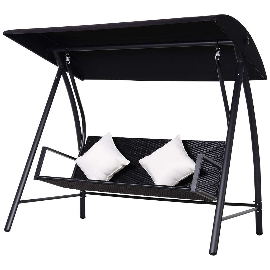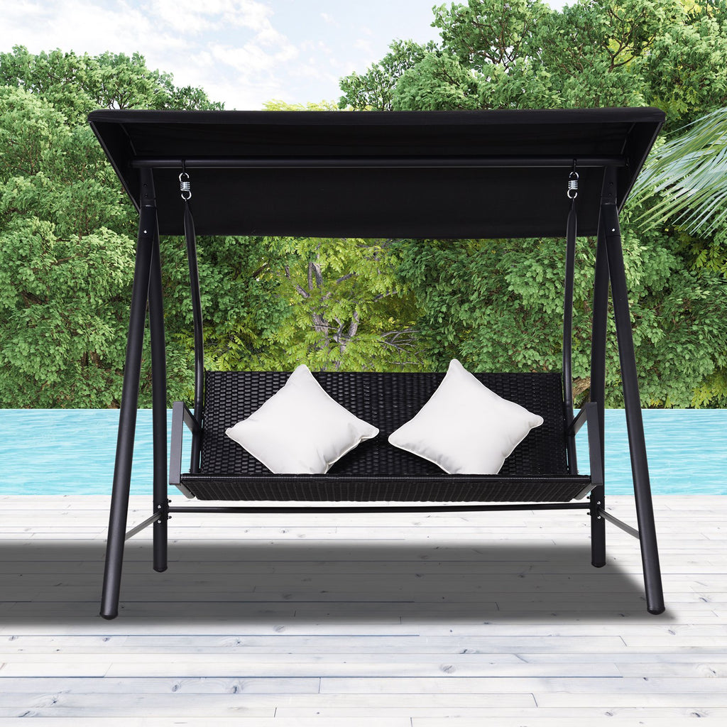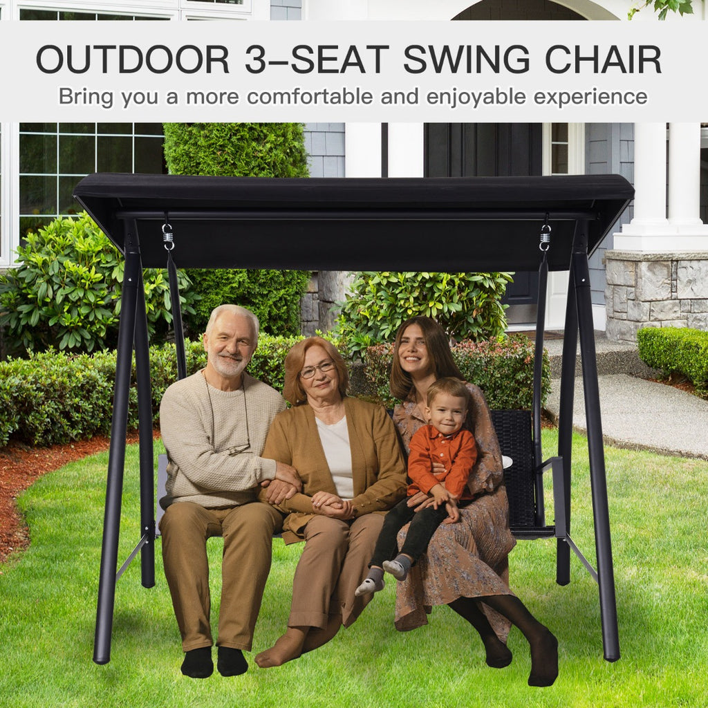 3-Sitzer-Gartenschaukel aus Eisen und Rattan mit Kissen und schwarzem Sonnendach