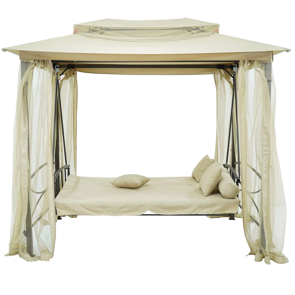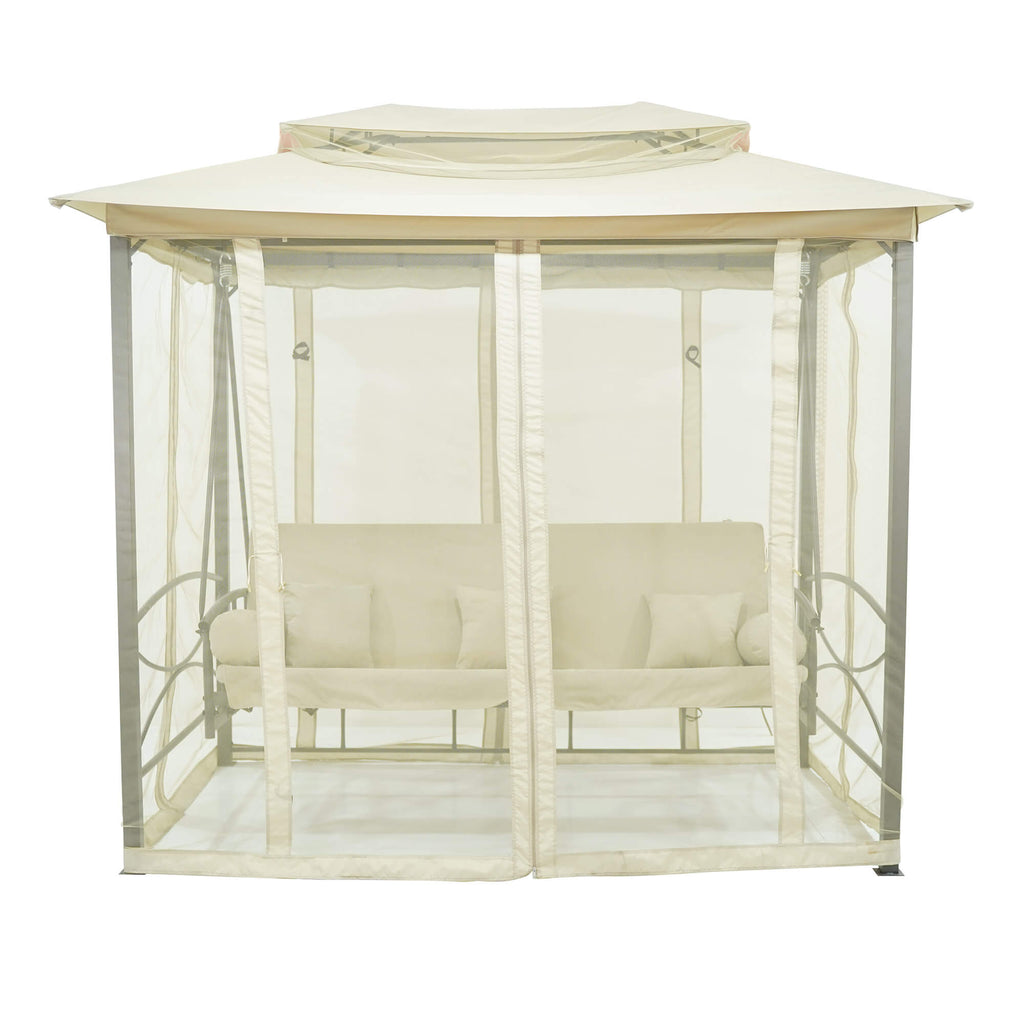 Schaukelbett 3 Sitze 255 x 175 x 250 cm mit Gazebo-Abdeckung und beigem Moskitonetz