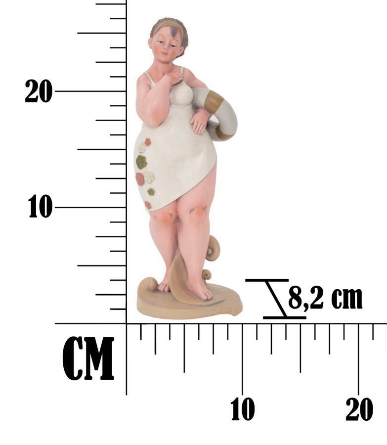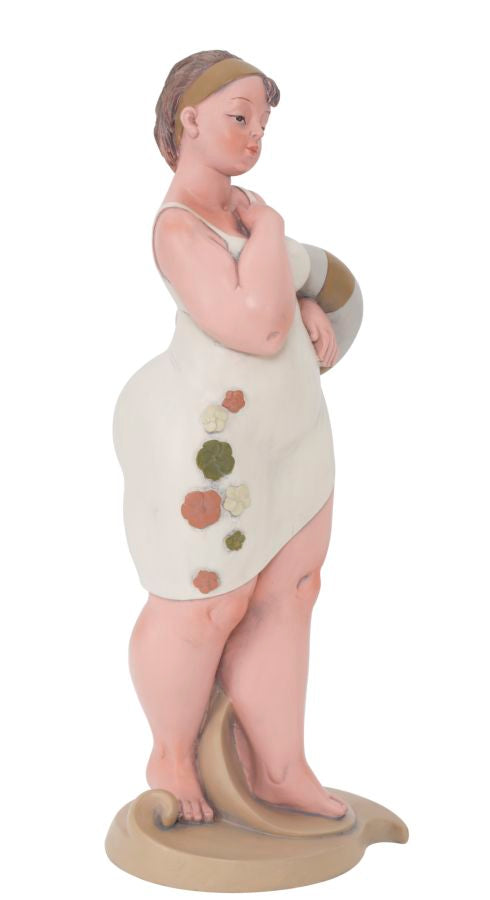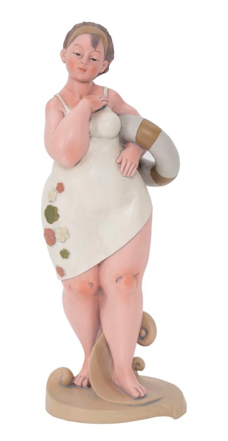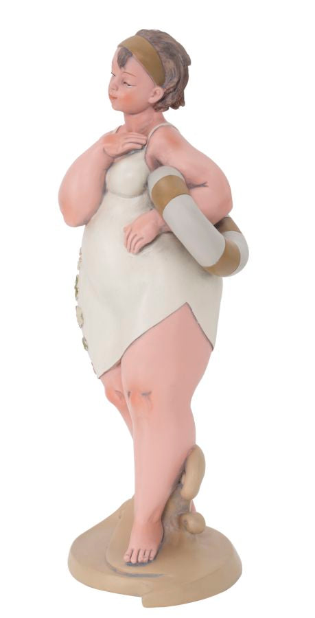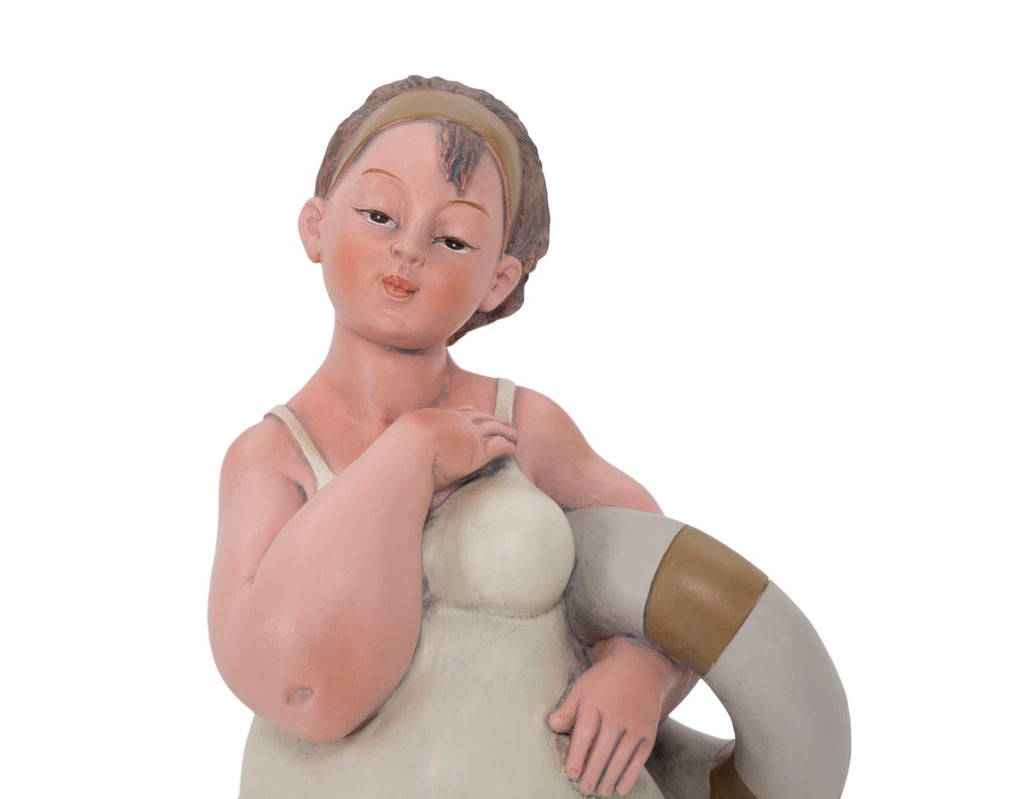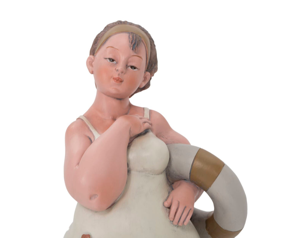 Statue einer Frau mit einem Rettungsring. Die traditionelle Kleidung erinnert an das italienische neorealistische Kino der 60er Jahre.Elegante Dekorationen aus Harz verleihen Ihrem Zuhause einen Hauch von Persönlichkeit oder werden zu hervorragenden Geschenkideen.