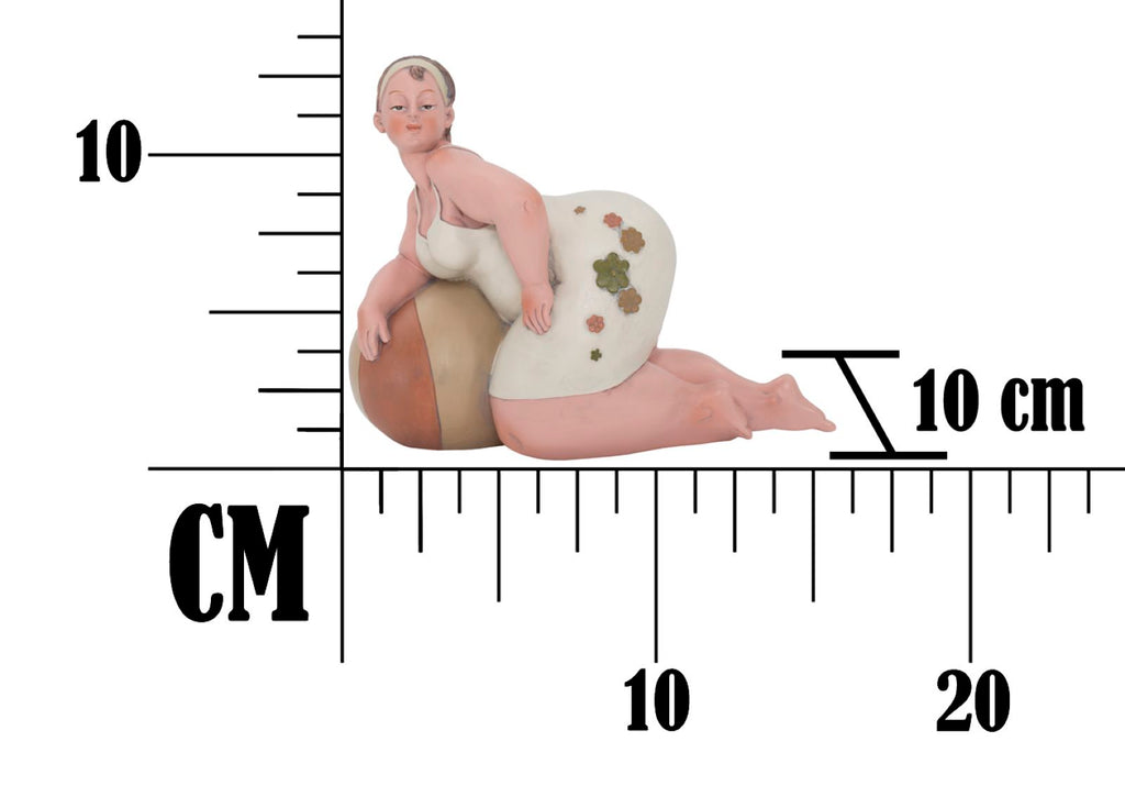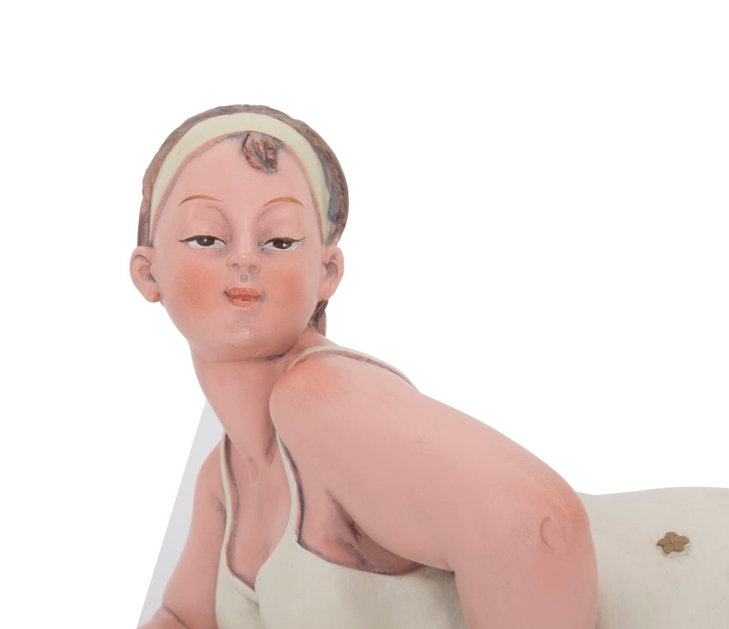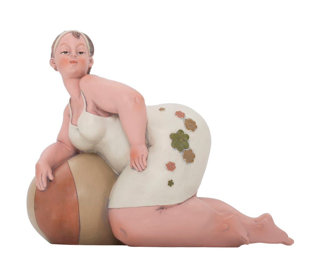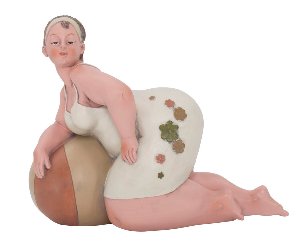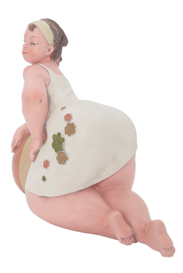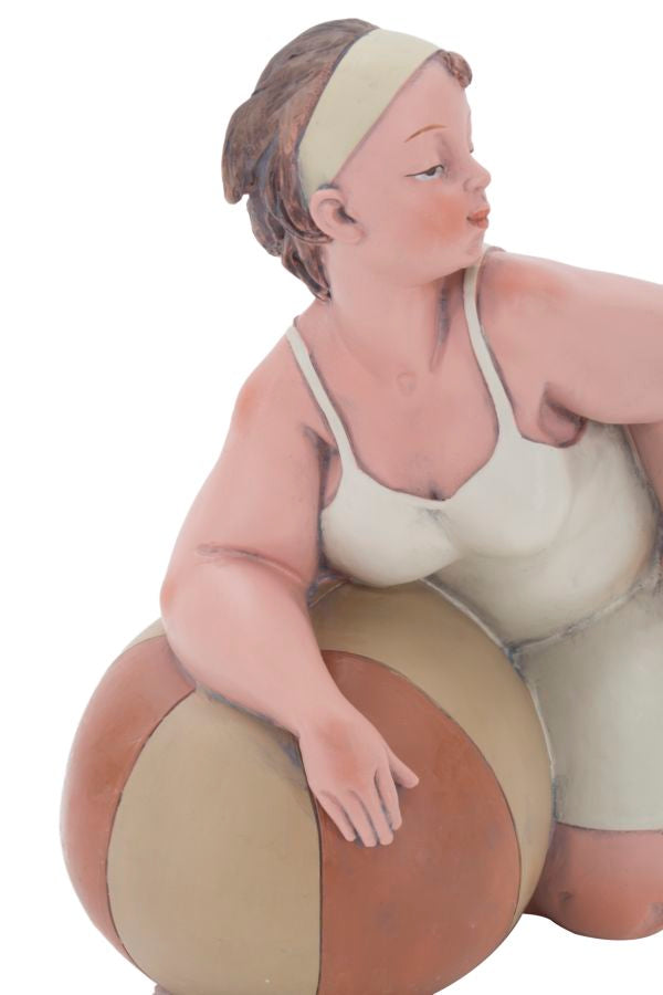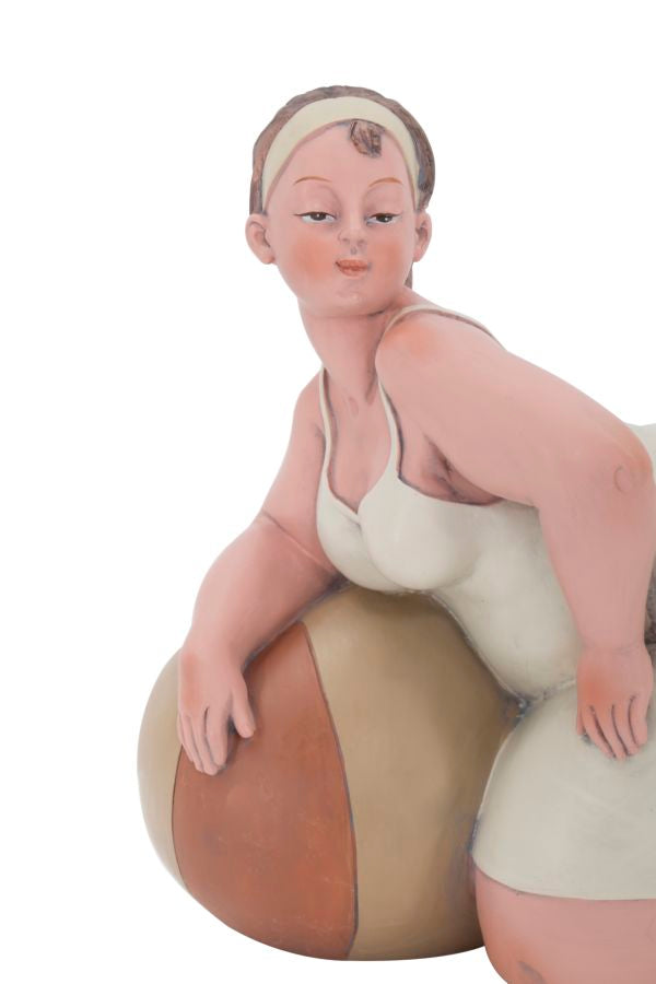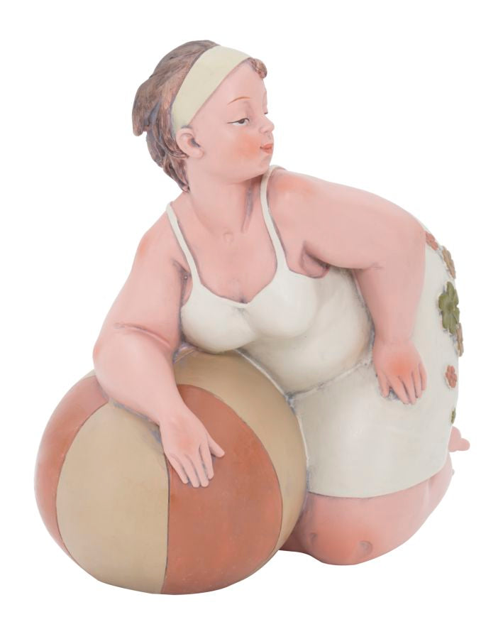 Statue einer Frau mit Wasserball. Die traditionelle Kleidung erinnert an das italienische neorealistische Kino der 60er Jahre.Elegante Dekorationen aus Harz verleihen Ihrem Zuhause einen Hauch von Persönlichkeit oder werden zu hervorragenden Geschenkideen.