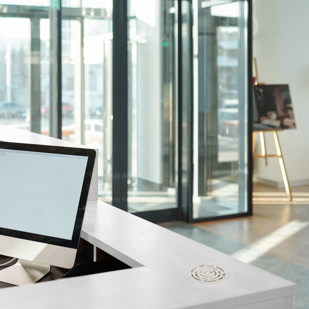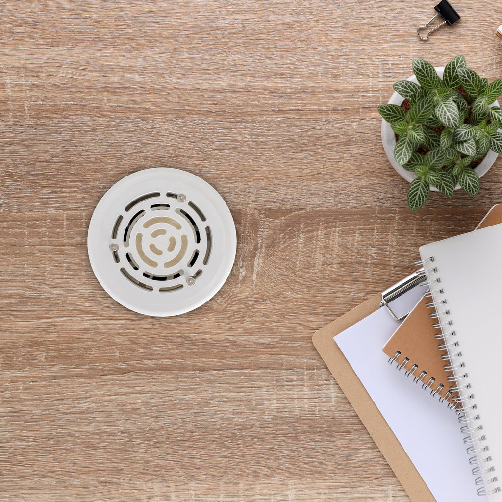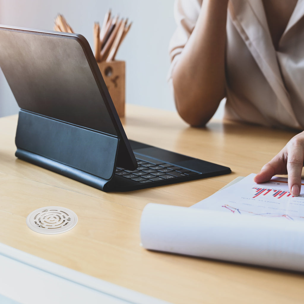 Die Montage ist sehr einfach, da nur eine Bearbeitung mit Ø80 mm erforderlich ist, um sie mit ihrem Befestigungsring in das Möbelstück einlassen zu können. Leicht austauschbare Lufterfrischertabletten durch Entfernen der oberen Kappe und Drehen sind ausreichend.