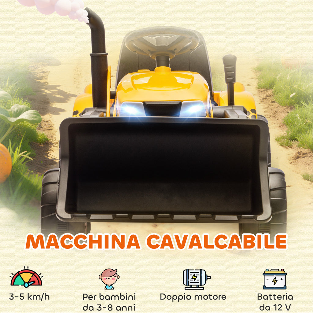 Escavatore per Bambini Elettrico 12V con Benna Rimorchio e Telecomando Età 3-8 Anni Giallo