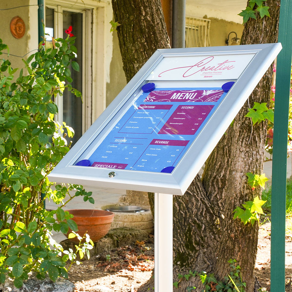 L'espositore a leggio con LED autoportante è realizzato con un leggero e resistente materiale in alluminio anodizzato silver. La sua base è magnetica e scrivibile, con un fondo metallico bianco che permette di apporre note o aggiornamenti in modo facile e veloce. L'anta in policarbonato trasparente si apre a ribalta e può essere bloccata con una serratura per garantire la sicurezza dei contenuti. Il pannello di intestazione, che può essere personalizzato con il logo dell'azienda o rimosso completamente, ha un formato 1xA4 e la cornice dell'espositore misura 29x47,7x2,3 cm, mentre la struttura ha dimensioni di 45x115 cm.