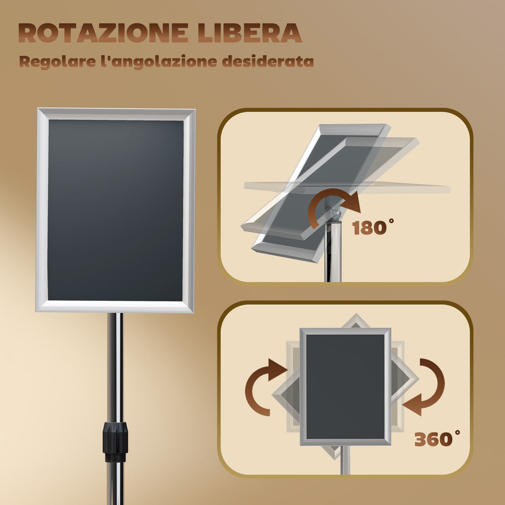 - REGOLABILE: L'espositore per poster permette di regolare l'altezza da 129 cm a 135 cm e di ruotare la cornice di 360°, con possibilità di inclinazione di 180° sia frontale che posteriore, per avere una visuale perfetta