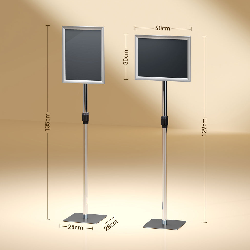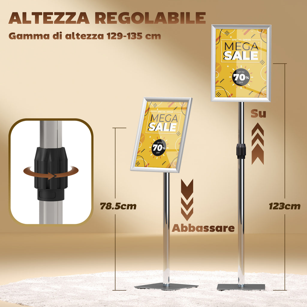 L'altezza è regolabile da 129 cm a 135 cm, telaio con rotazione di 360° e inclinazione anteriore e posteriore di 180° per una visione ottimale. Espositore pubblicitario con pellicola protettiva trasparente antiriflesso in plastica che protegge i poster da danni. Cornici a scatto frontali che semplificano la sostituzione dei poster. Base in acciaio inossidabile e palo in alluminio resistono a vento e acqua. Espositore poster adatto per uso sia interno che esterno. Montaggio necessario.