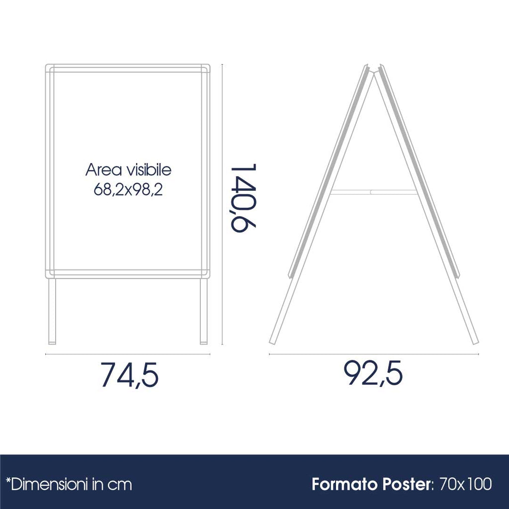Il cavalletto bifacciale Premium è realizzato in alluminio estruso, conferendo così leggerezza e resistenza al prodotto. Dotato di 2 cornici a scatto ad angolo tondo con un frame di 32 mm, offre un aspetto estetico accattivante e moderno. La sua base è realizzata in lamiera grigia e presenta fogli di protezione frontale in PVC antiriflesso, garantendo una perfetta visibilità del poster esposto. Le dimensioni complessive del cavalletto sono di 54,3x90,5x84 cm, mentre le dimensioni adatte per un poster sono di 50x70 cm.