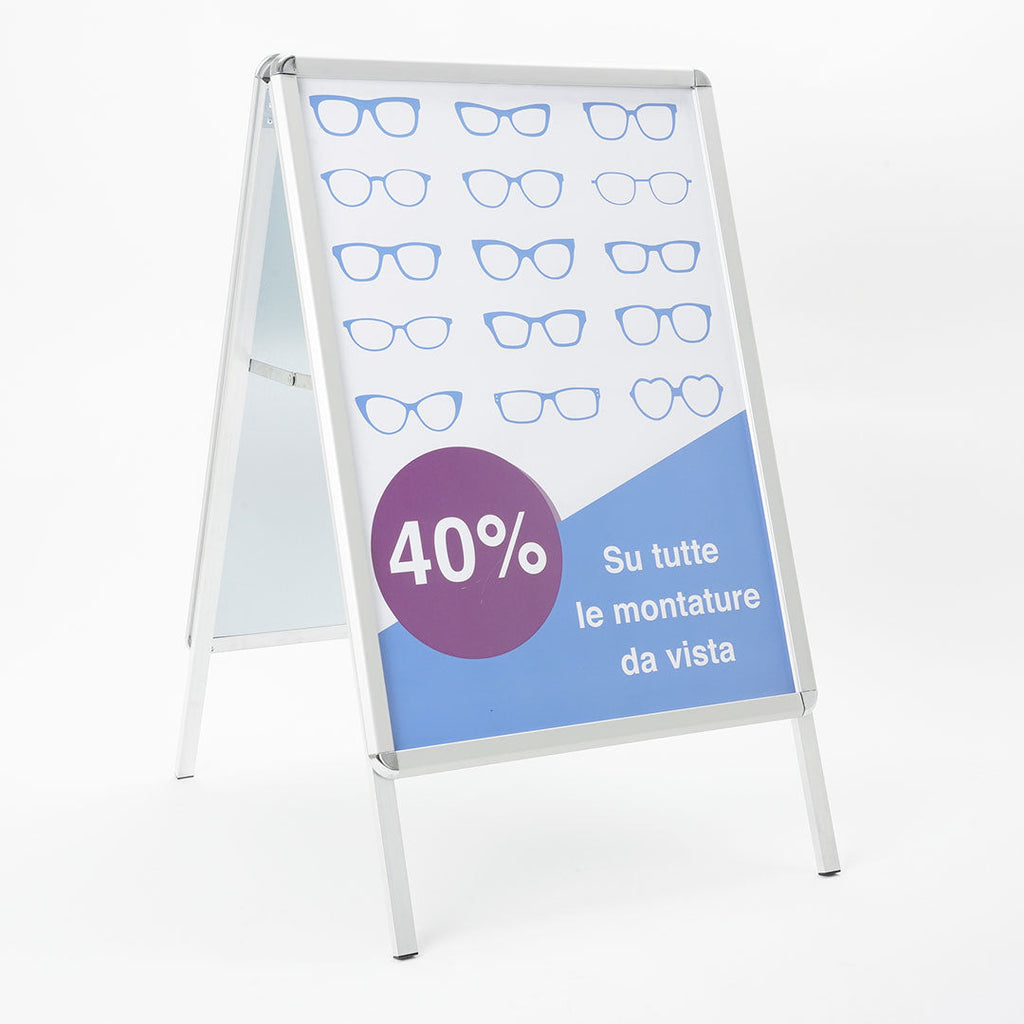 Espositore Pubblicitario Bifacciale a Cavalletto Pieghevole 66x131x79 cm in Alluminio SilverEspositore Pubblicitario Bifacciale a Cavalletto Pieghevole 66x131x79 cm in Alluminio Silver