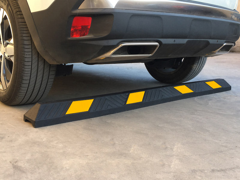Radstopper aus vulkanisiertem Gummi, ausgestattet mit Griffen an den Enden, um den Transport und die Installation zu erleichtern. Ideal für private Bereiche, die für öffentliche Verkehrsmittel gesperrt sind.