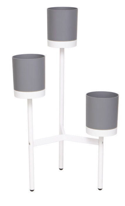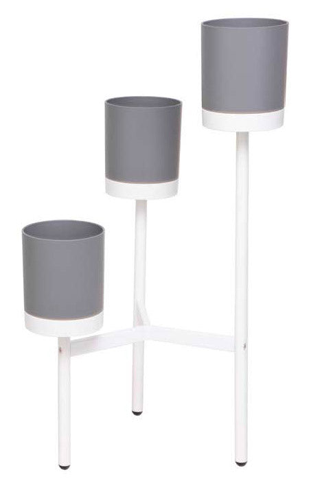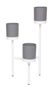 I tre portavasi sono realizzati in polipropilene bianco e sono dotati di un basamento forato per permettere la fuoriuscita dell'acqua in eccesso. Il basamento è realizzato in lega di acciaio verniciato bianco. È necessario pulire regolarmente la parte in plastica con un panno pulito o una spugna imbevuta di acqua tiepida, evitando l'uso di oggetti appuntiti per non graffiare la superficie. Per la parte metallica basterà passare un panno asciutto.