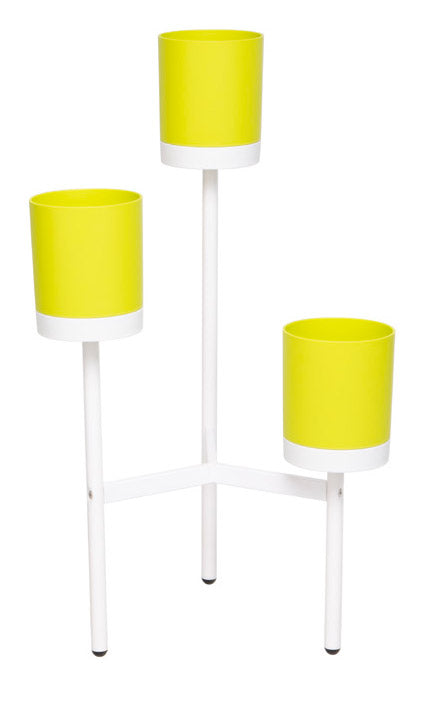 I tre portavasi sono realizzati in polipropilene bianco e sono dotati di un basamento forato per permettere la fuoriuscita dell'acqua in eccesso. Il basamento è realizzato in lega di acciaio verniciato bianco. È necessario pulire regolarmente la parte in plastica con un panno pulito o una spugna imbevuta di acqua tiepida, evitando l'uso di oggetti appuntiti per non graffiare la superficie. Per la parte metallica basterà passare un panno asciutto.