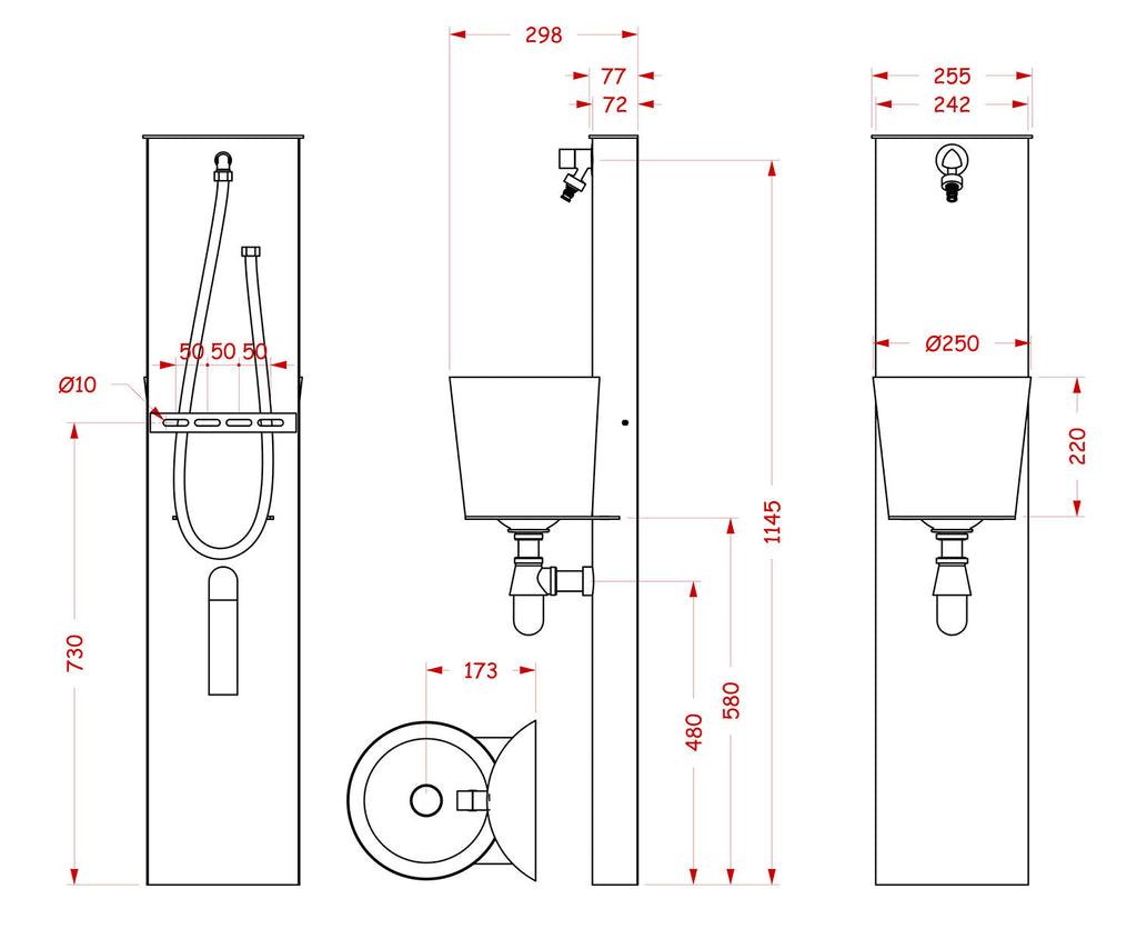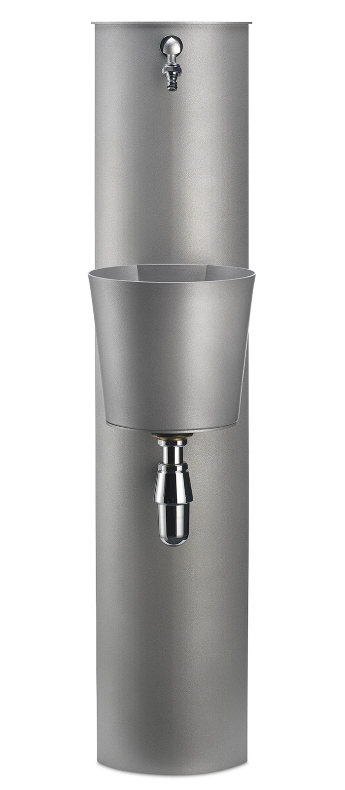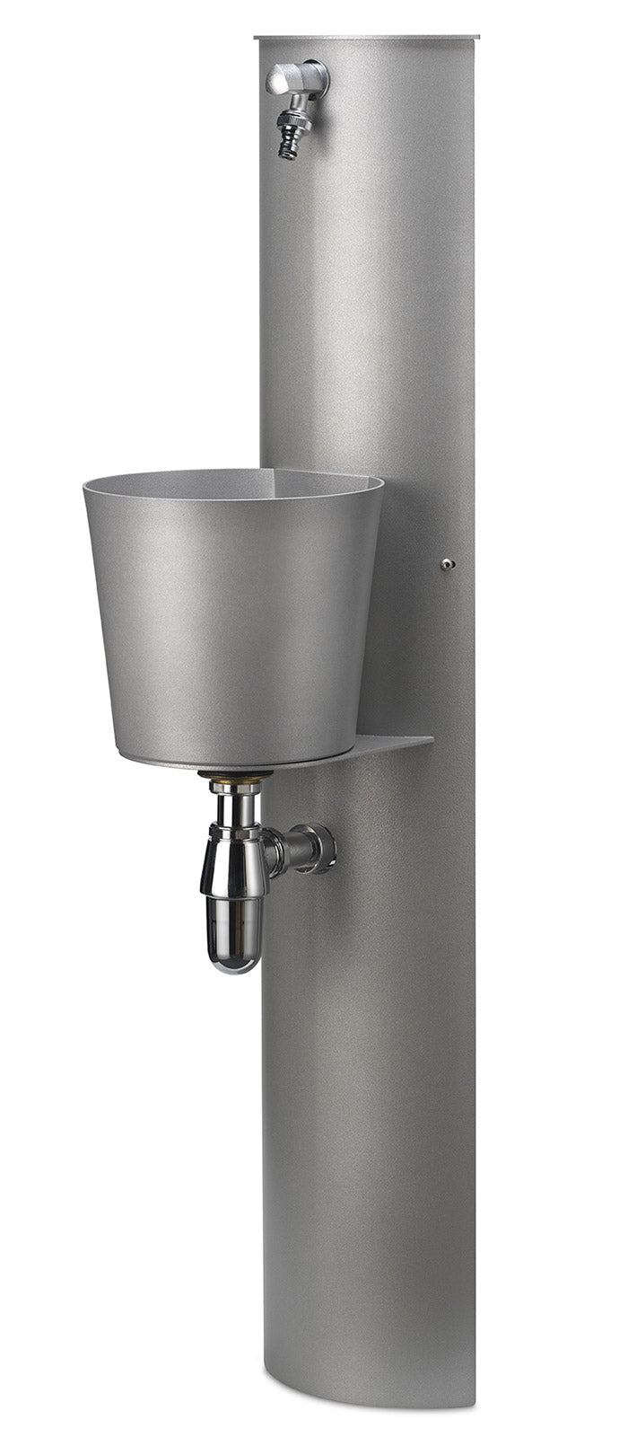 Gartenwandbrunnen mit innovativem und originellem Design , 42/PRT mit Wasserhahn und Eimer von Belfer , der die Installation mit Wasser-/Abflussanschlüssen in variablen Höhen ermöglicht: Wasseranschlusshöhe von 0 bis 116 cm, Ablaufanschlusshöhe von 0 bis 55 cm.